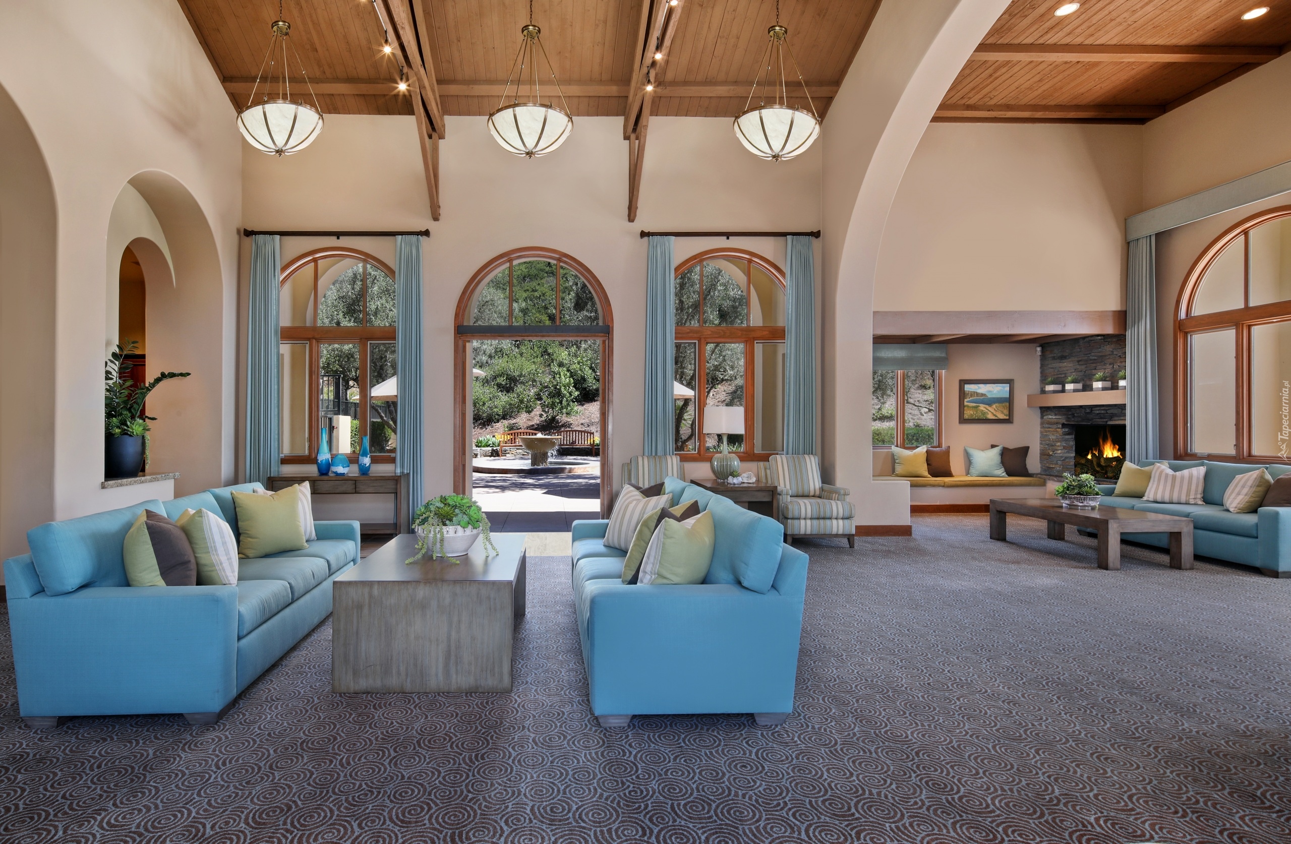 Edytor tapety: Przestronny salon z widokiem na fontannę w ogrodzie