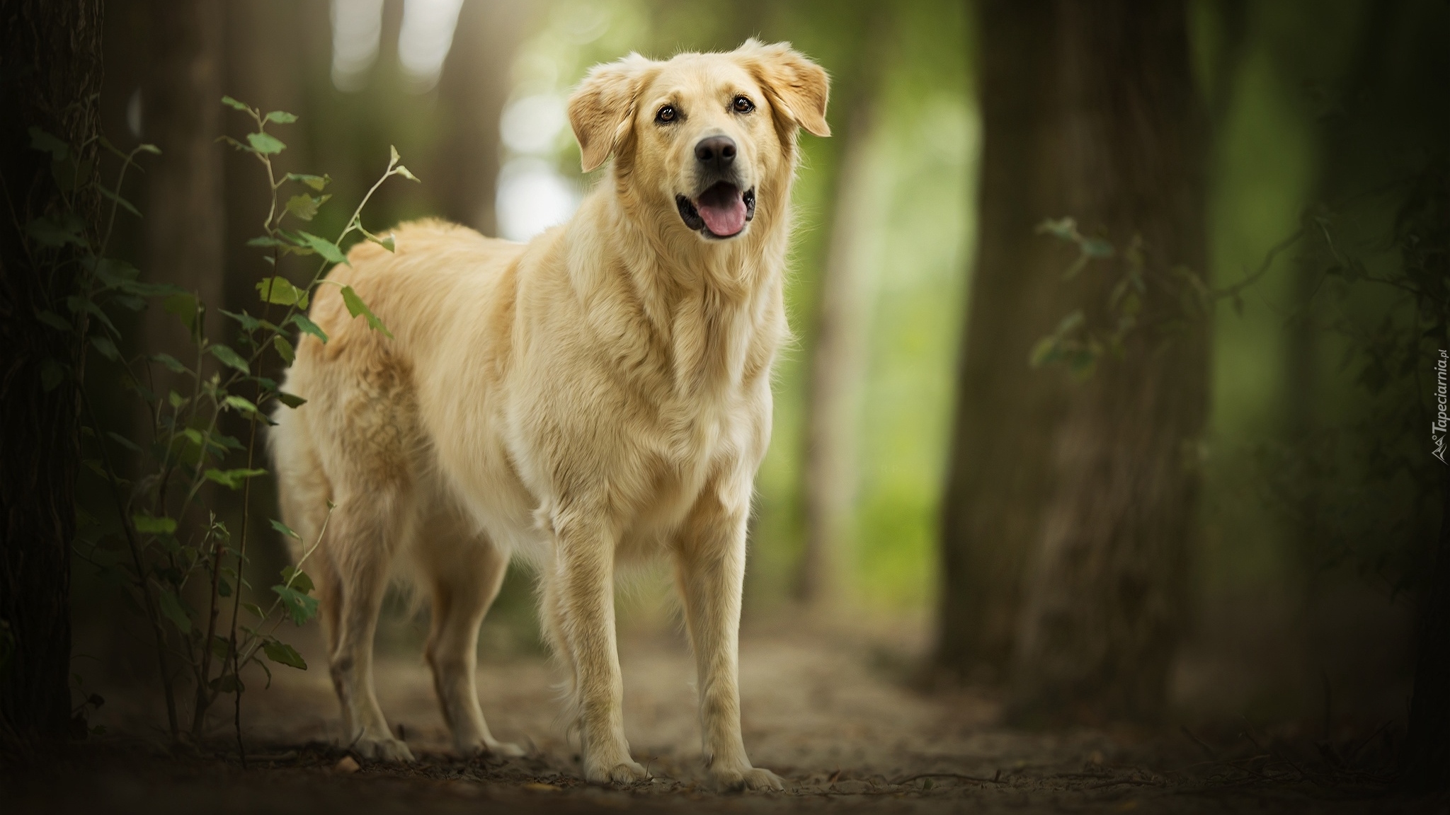 Edytor tapety: Golden retriever na leśnej ścieżce