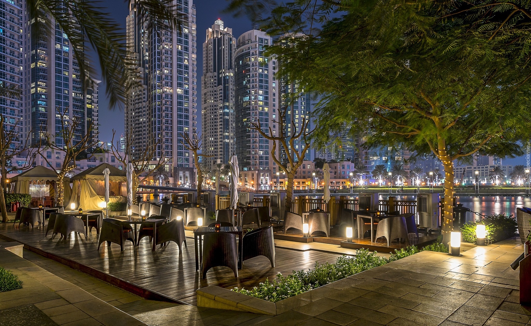 Edytor tapety: Oświetlony taras przy hotelu Palace Downtown w Dubaju