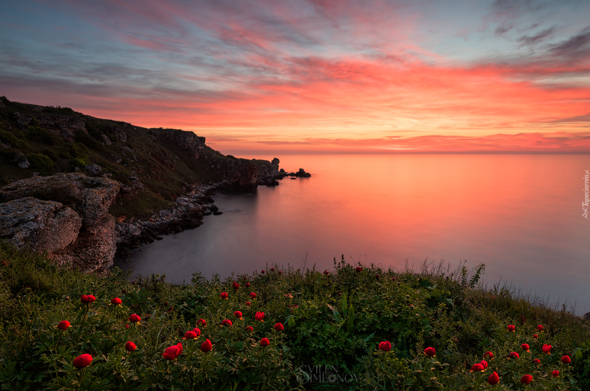 Edytor tapety: Wybrzeże w kwiatach o zachodzie słońca