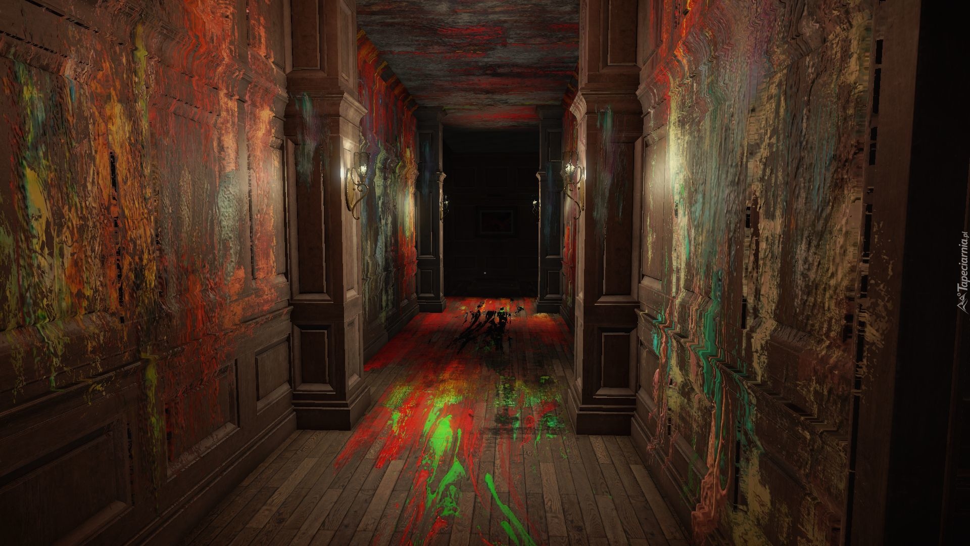 Edytor tapety: Kolorowa farba rozmazana na podłodze i ścianach korytarza