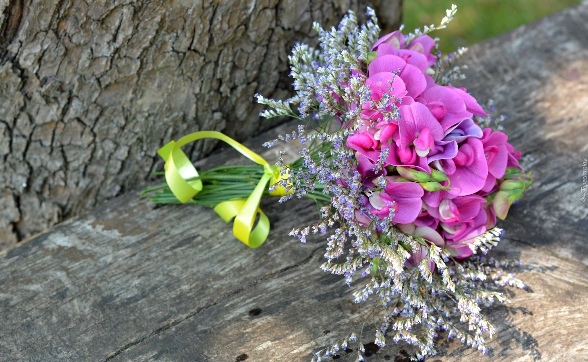 Edytor tapety: Bukiet pachnącego groszku na deskach