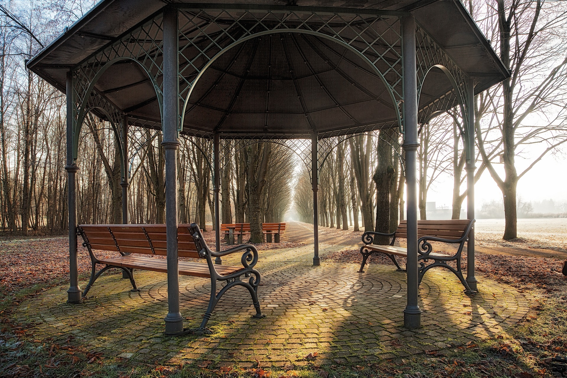 Edytor tapety: Altana z ławkami w promieniach słońca
