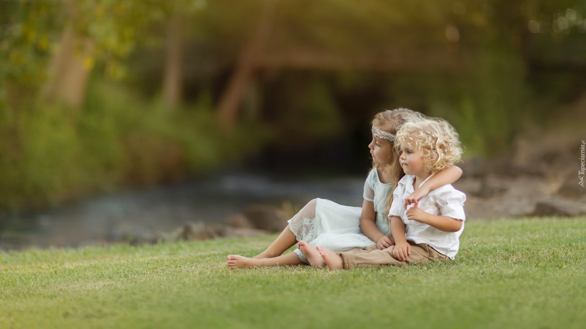 Edytor tapety: Dziewczynka i chłopiec siedzą na trawie