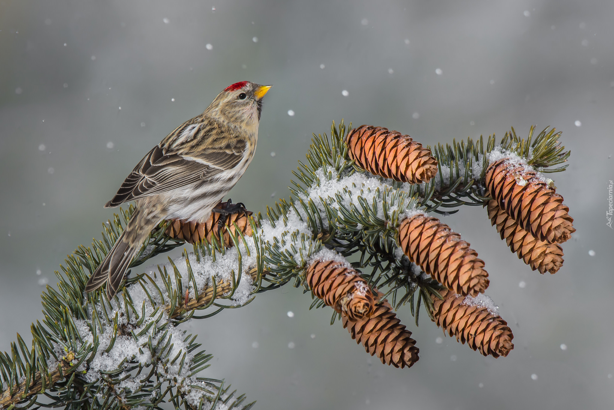 Edytor tapety: Czeczotka zwyczajna na gałązce świerku z szyszkami