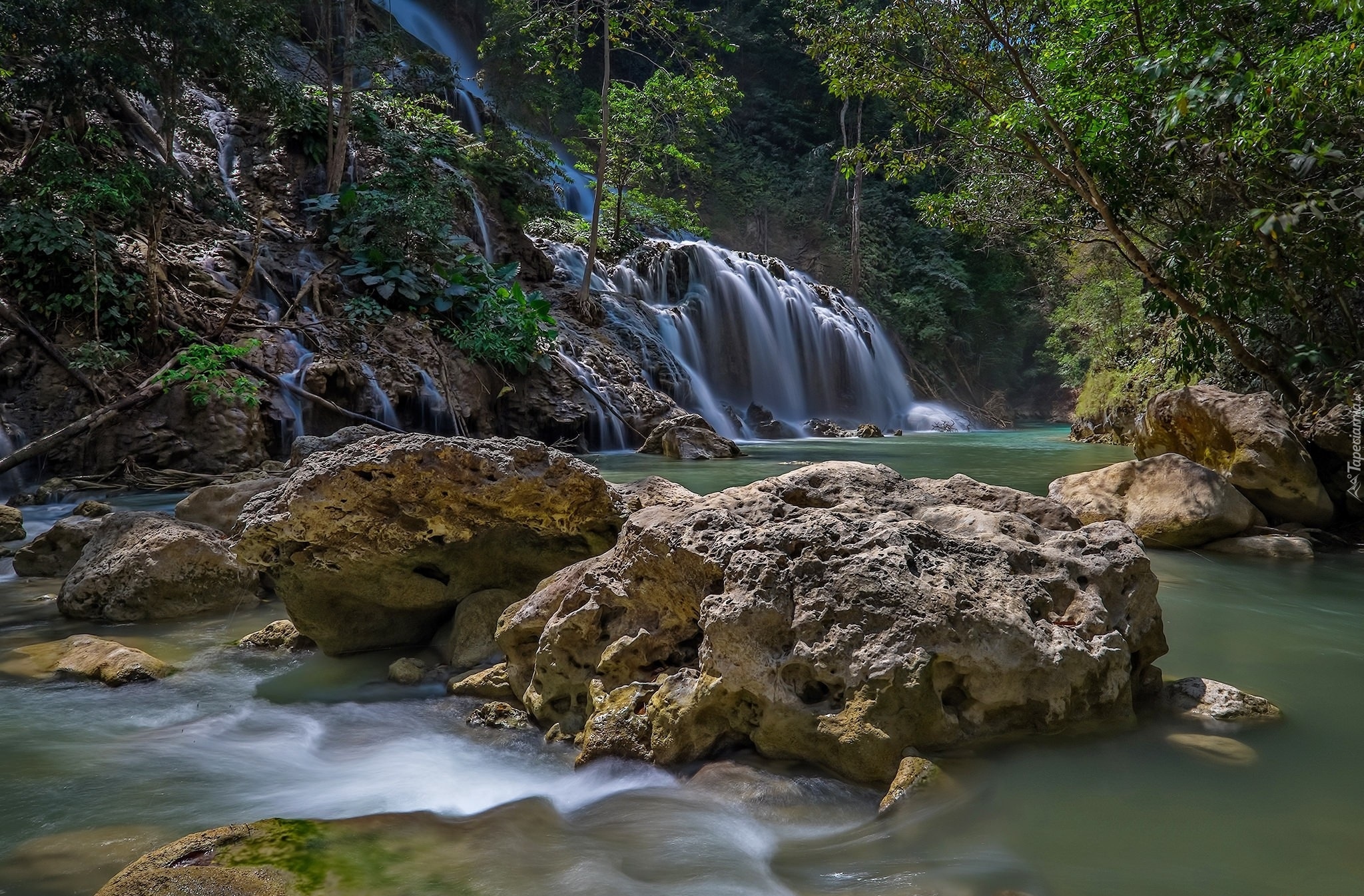 Edytor tapety: Skalny wodospad wpadający do rzeki