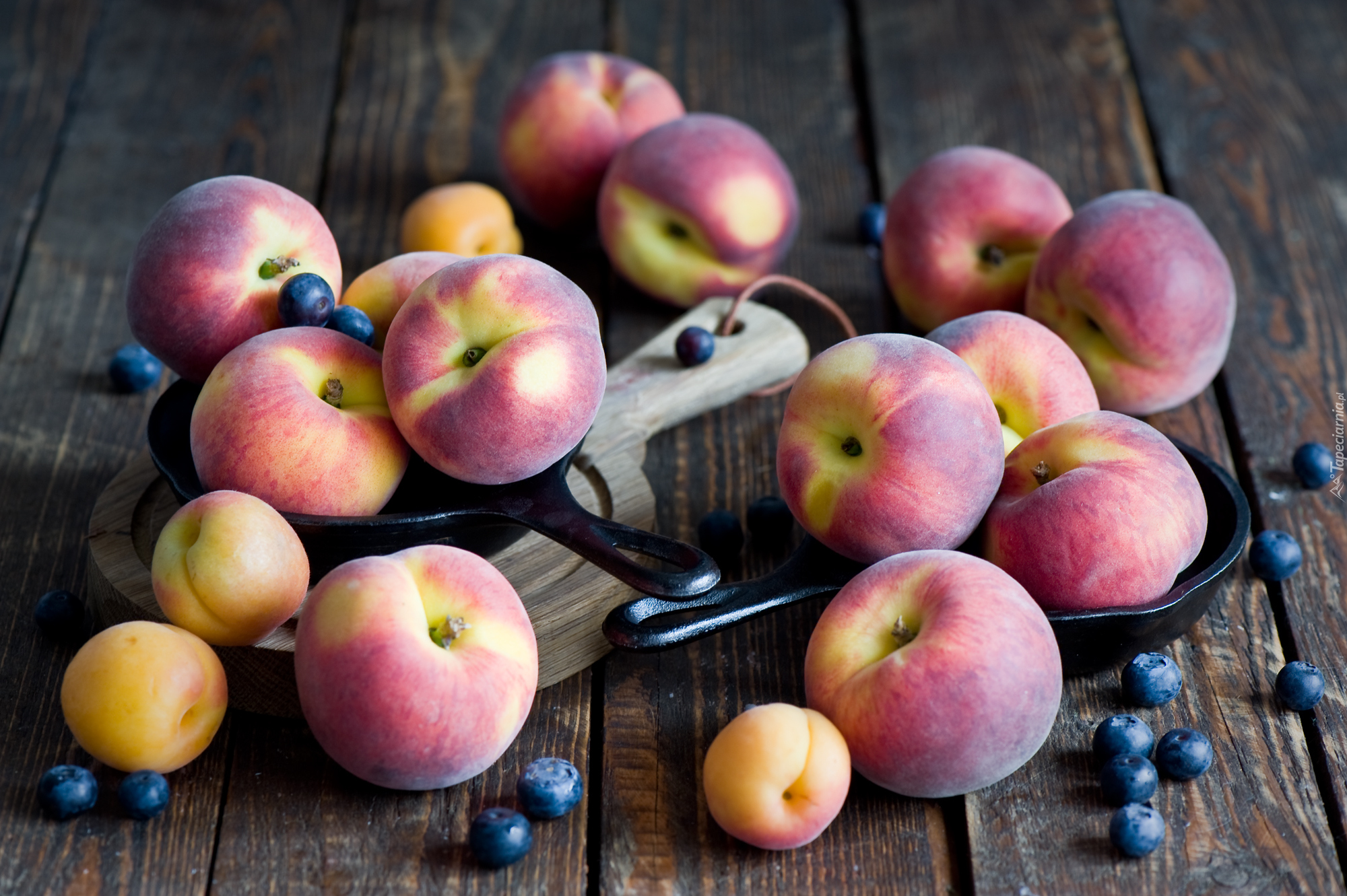 Edytor tapety: Brzoskwinie i borówki rozsypane na deskach