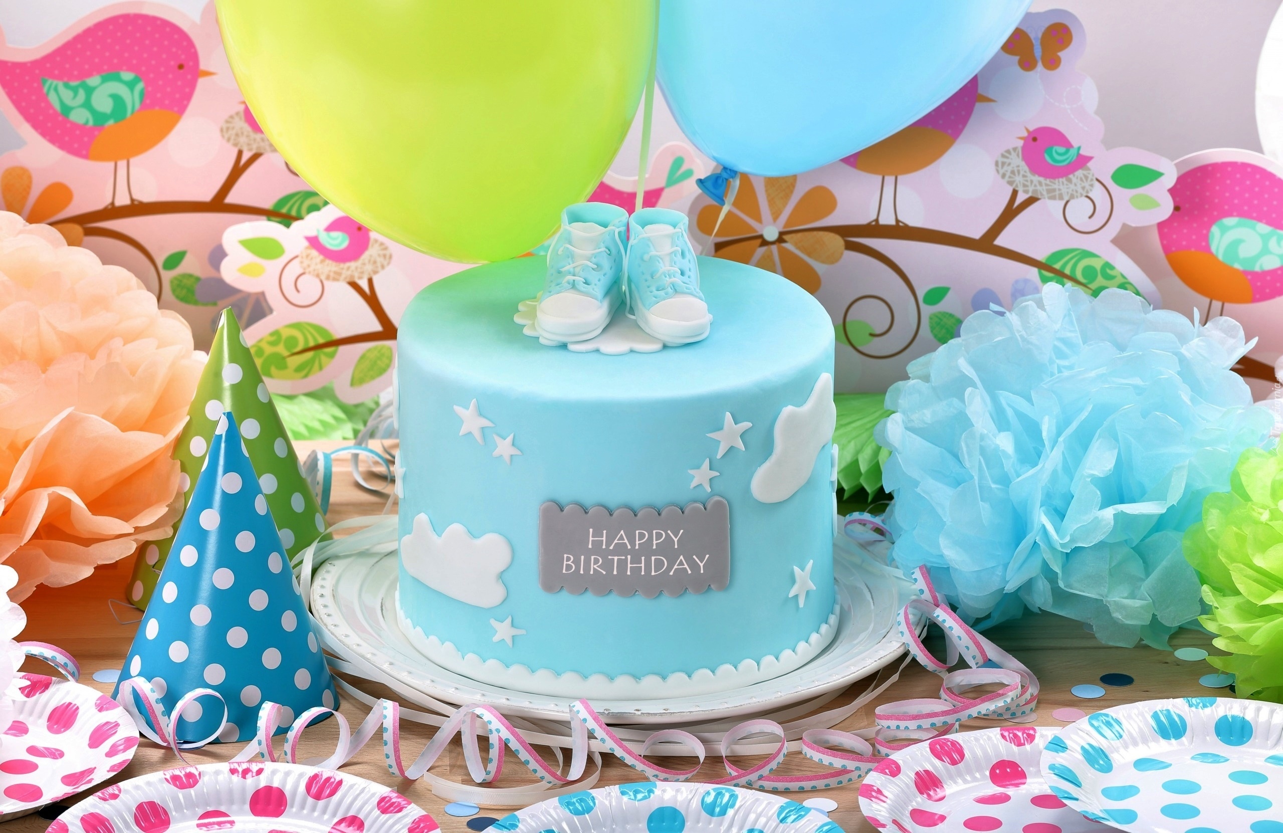 Edytor tapety: Kwiaty i balony obok urodzinowego tortu dla chłopczyka