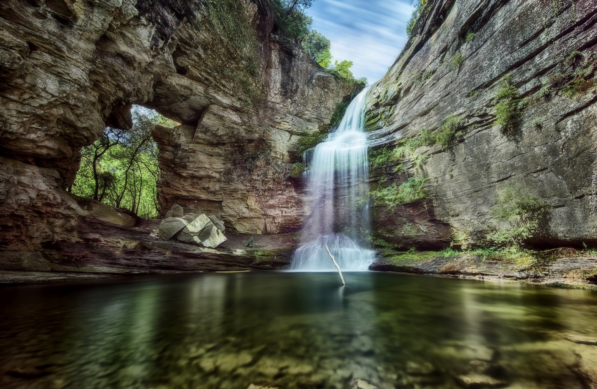 Edytor tapety: Wodospad spływający po skałach