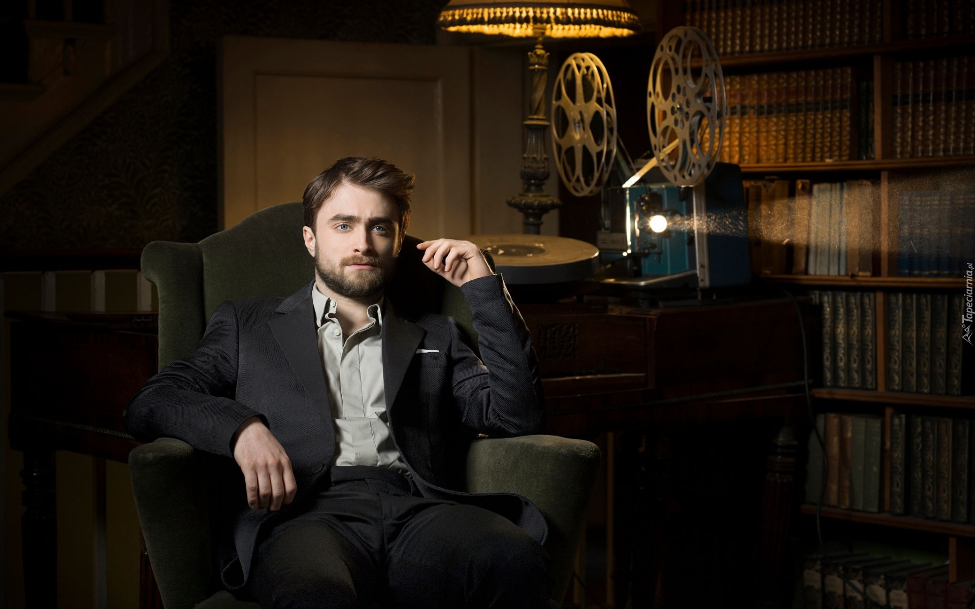 Edytor tapety: Aktor Daniel Radcliffe ogląda film przy właczonym projektorze