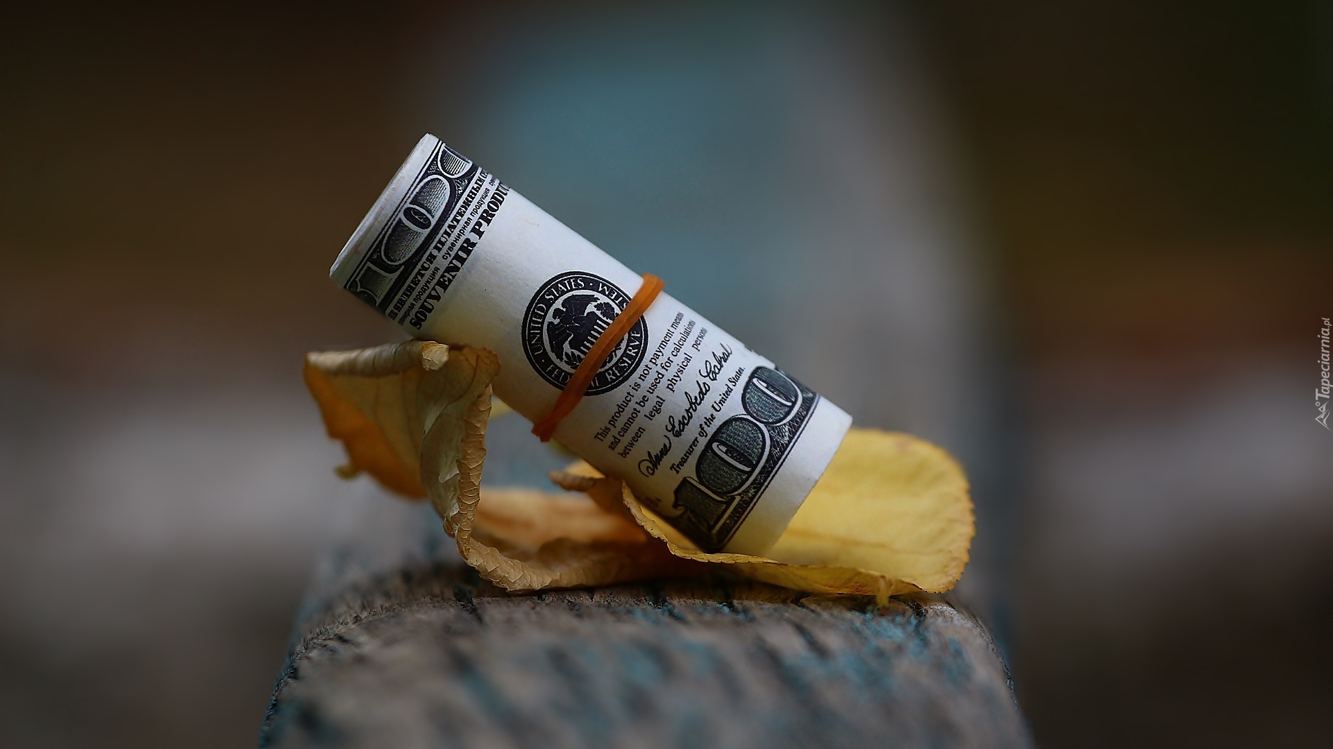 Edytor tapety: Rulon banknotów studolarowych na uschniętym liściu