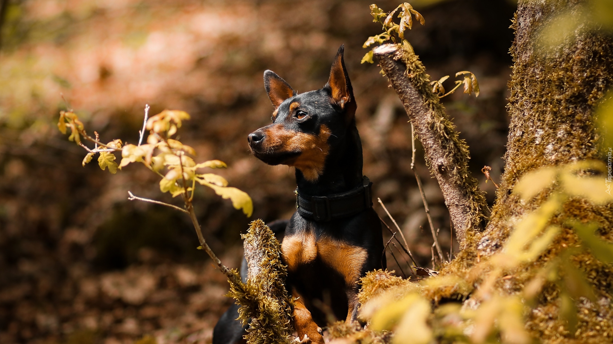 Edytor tapety: Pinczer miniaturowy przy omszałym drzewie