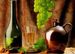 Edytor tapety: Winogrona i kieliszek z winem pomiędzy butelką i karafką