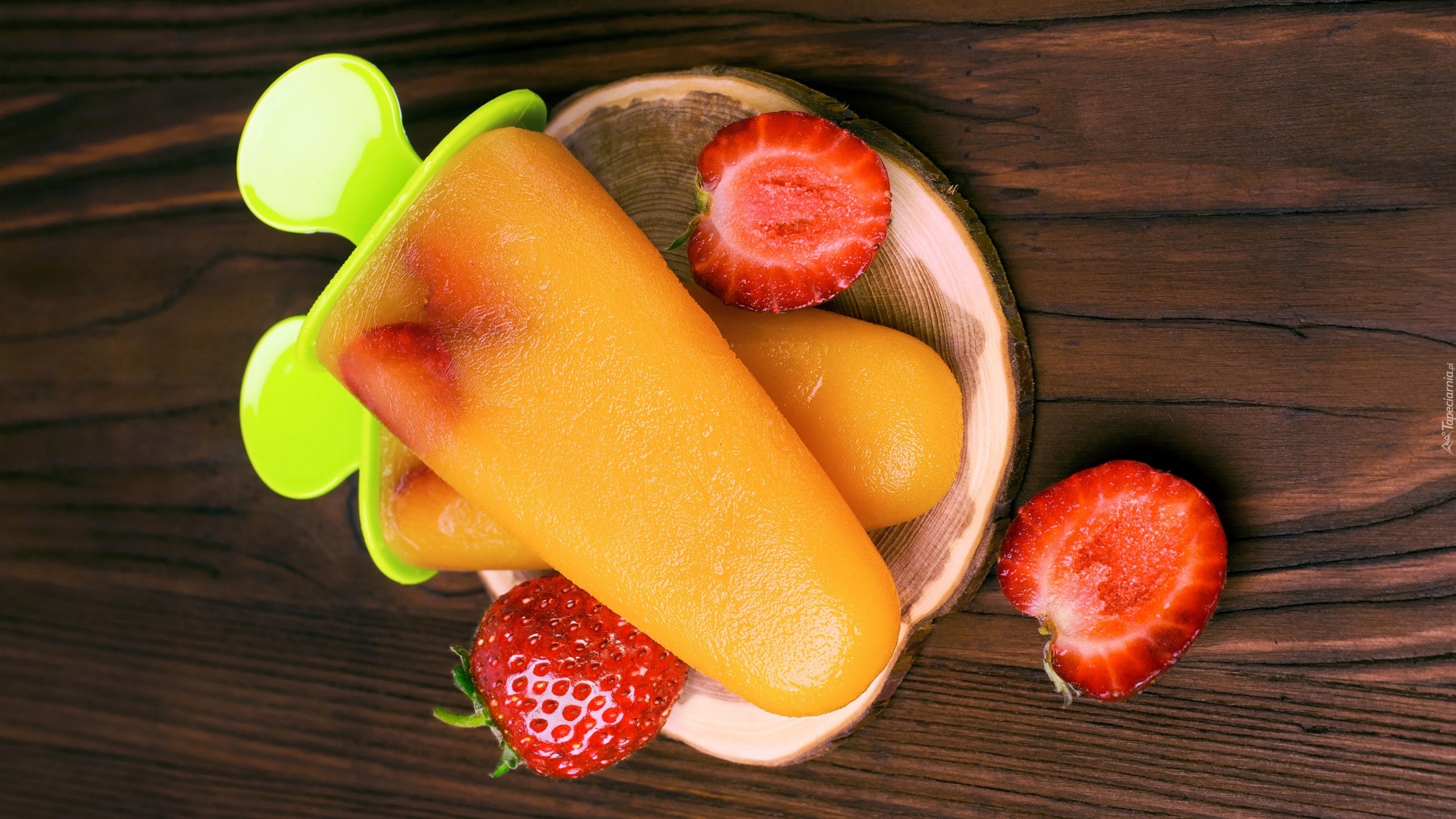 Edytor tapety: Owocowe lody na patyczkach i truskawki na desce