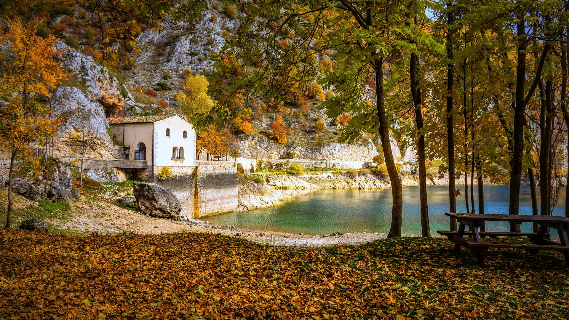Edytor tapety: Ławeczka pod drzewami nad jeziorem w pobliżu domu