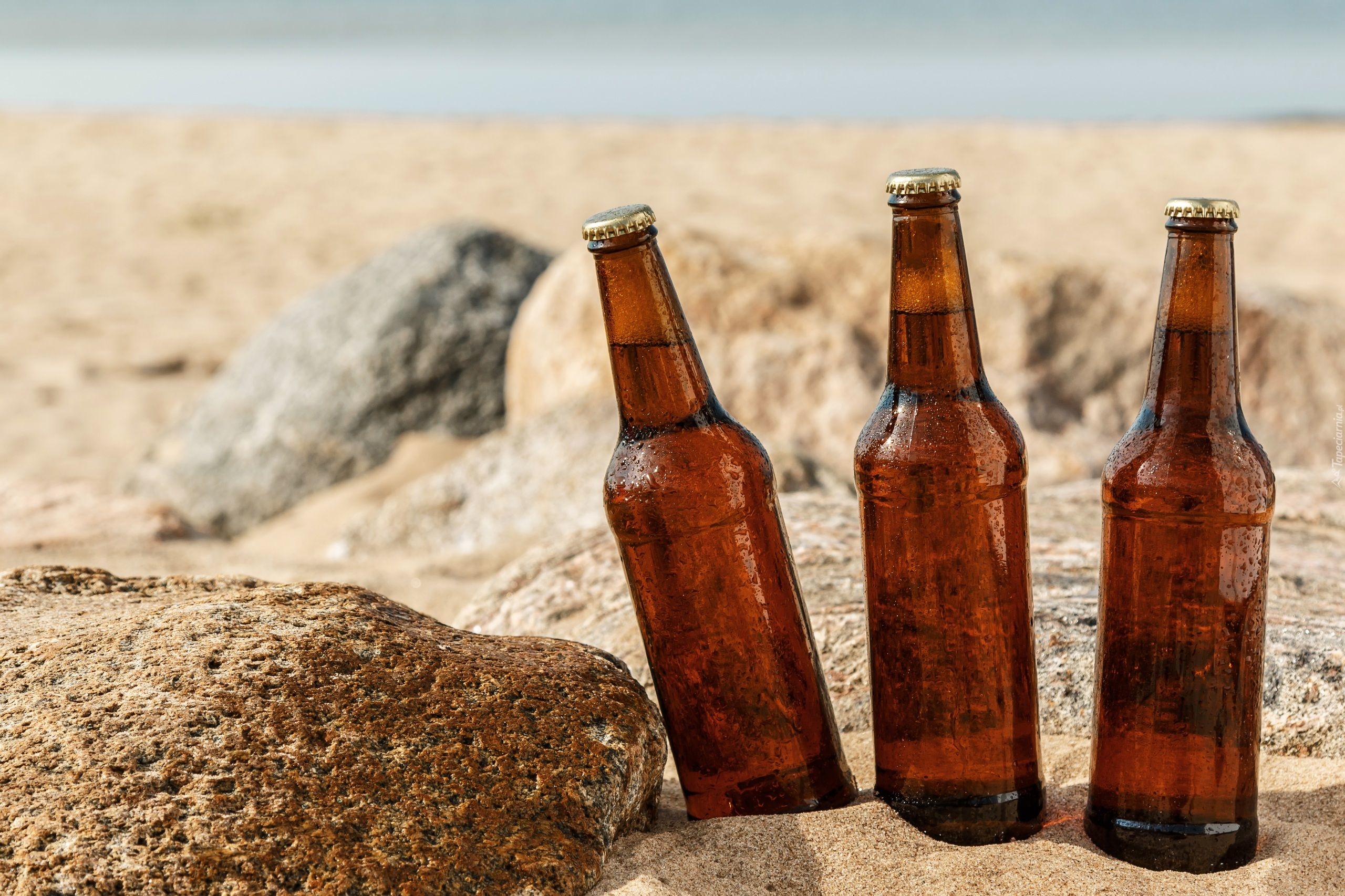 Edytor tapety: Trzy schłodzone butelki piwa na piasku