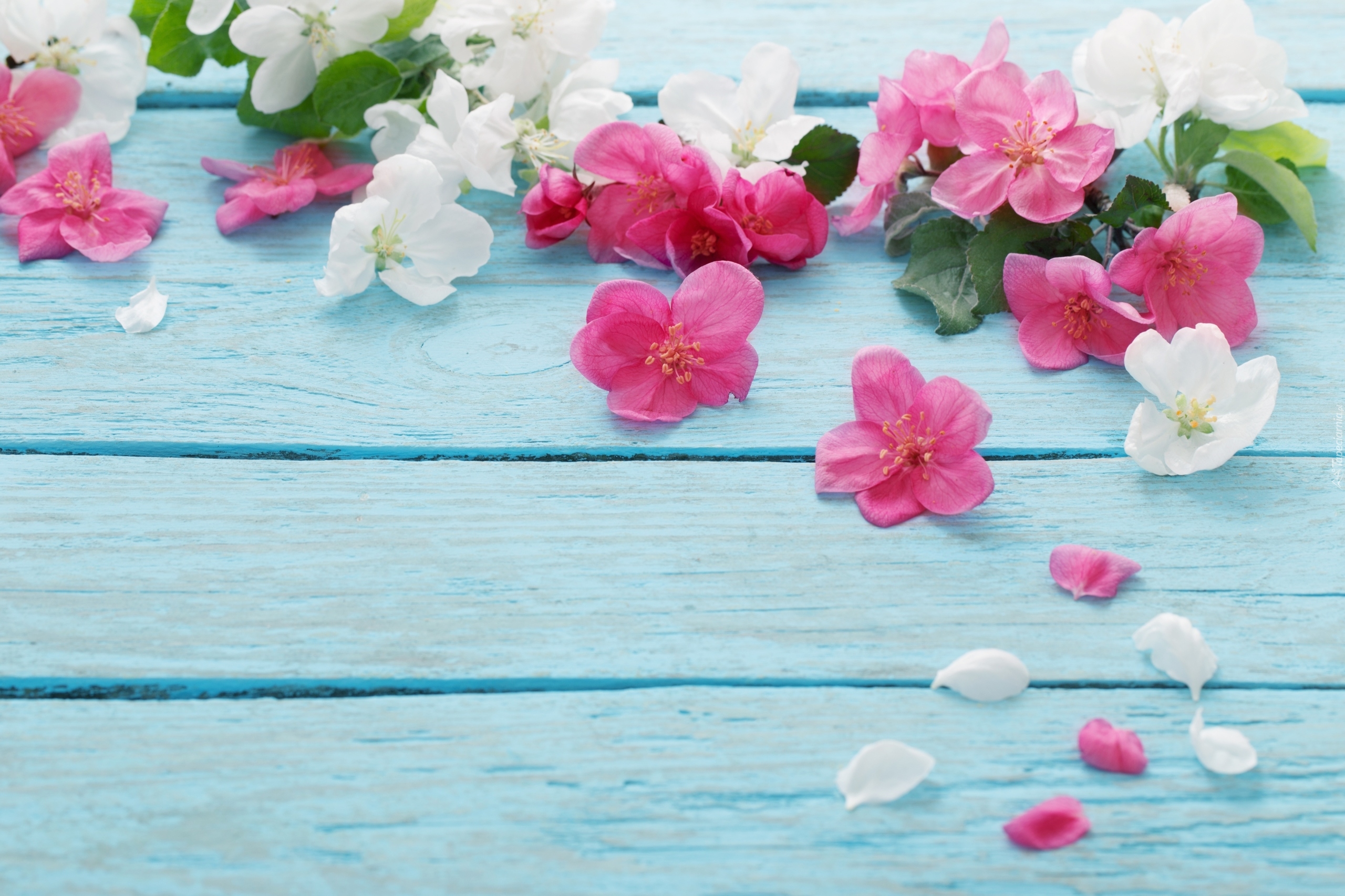 Edytor tapety: Kolorowe kwiatki i płatki rozsypane na deskach