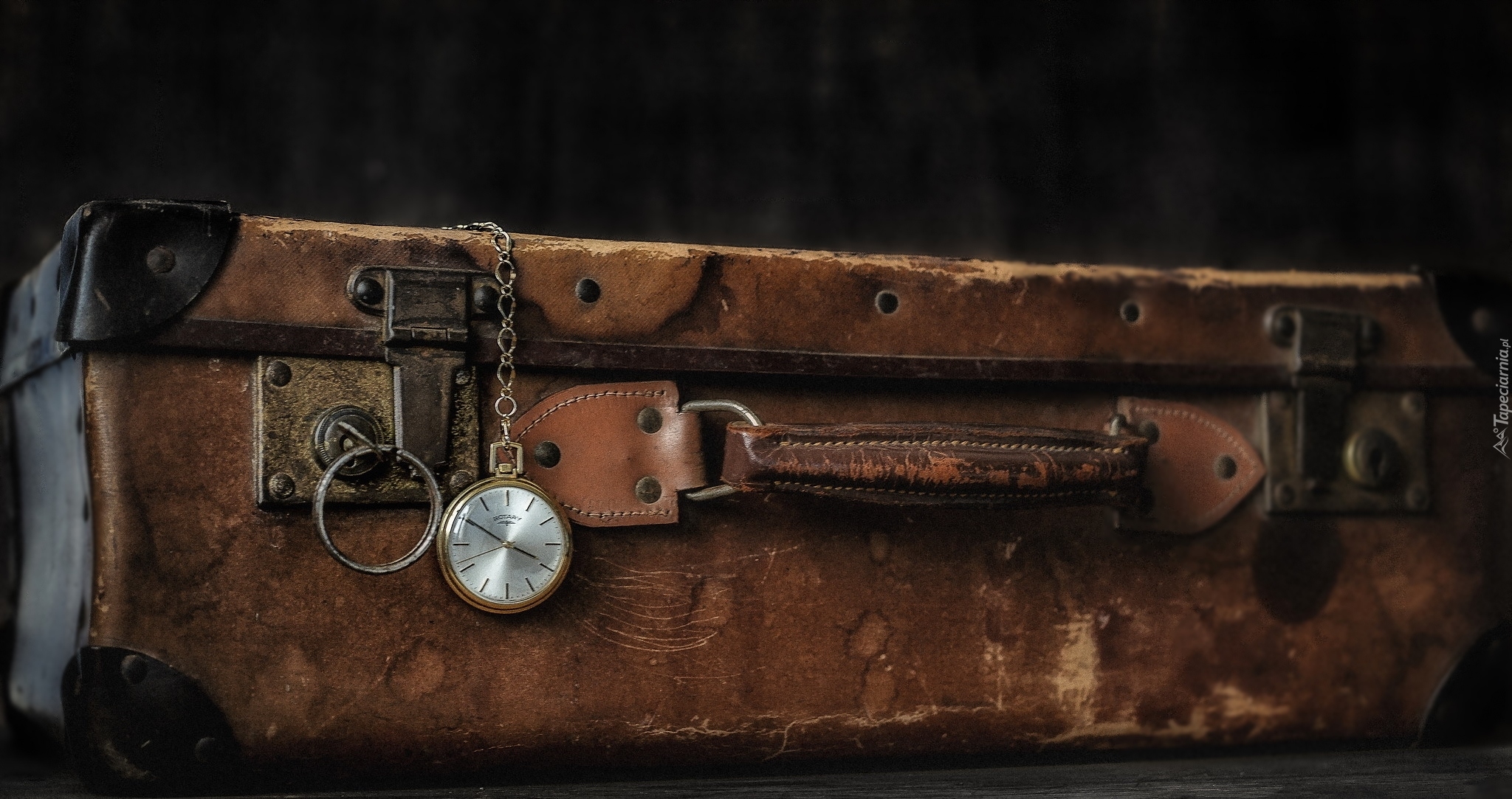 Edytor tapety: Kieszonkowy zegarek zwisający ze starej zniszczonej walizki