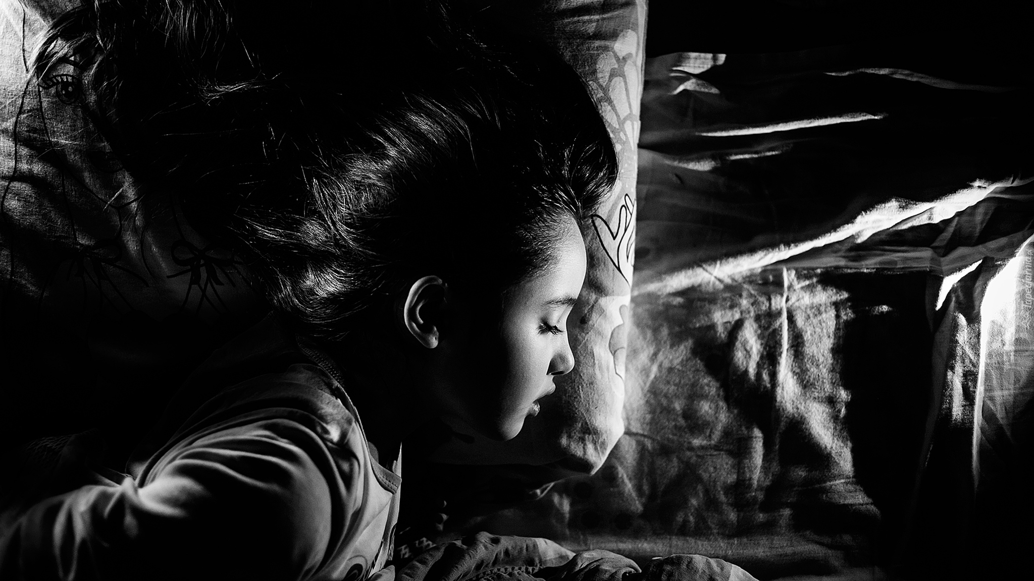 Edytor tapety: Czarno-białe zdjęcie śpiącej dziewczynki