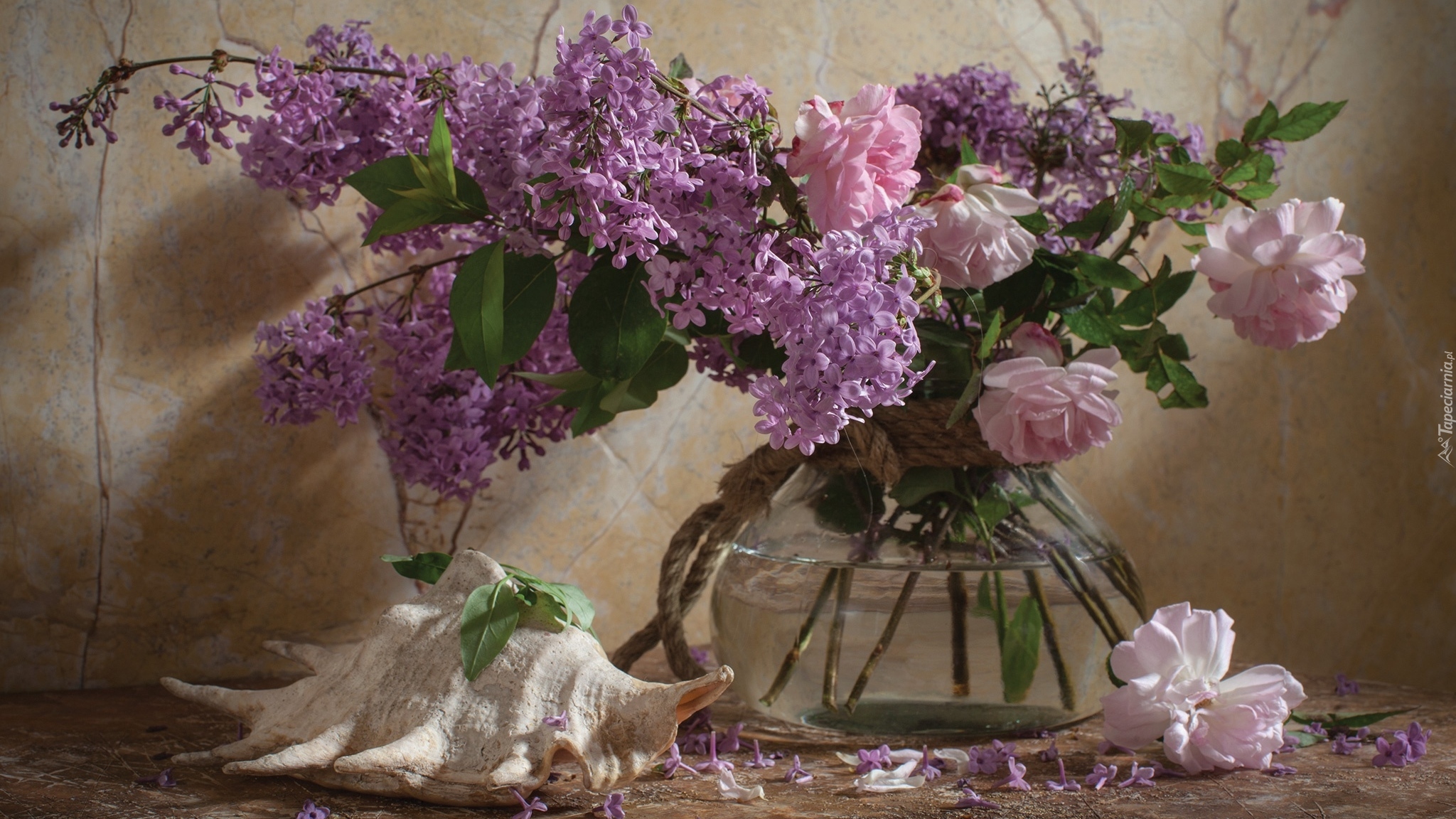 Edytor tapety: Muszla obok wazonu z bukietem bzu i róż