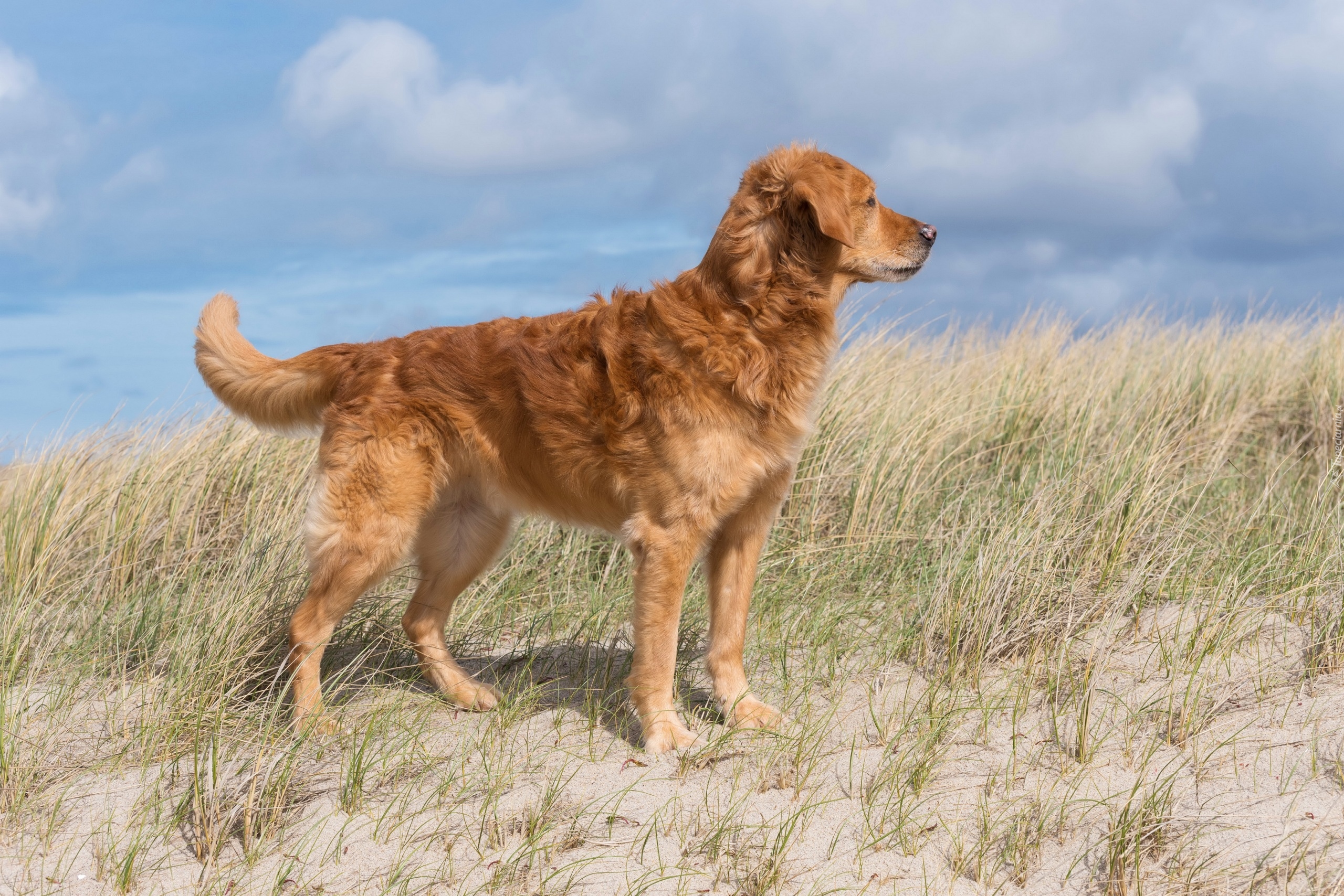 Edytor tapety: Golden retriever na piaszczystej wydmie