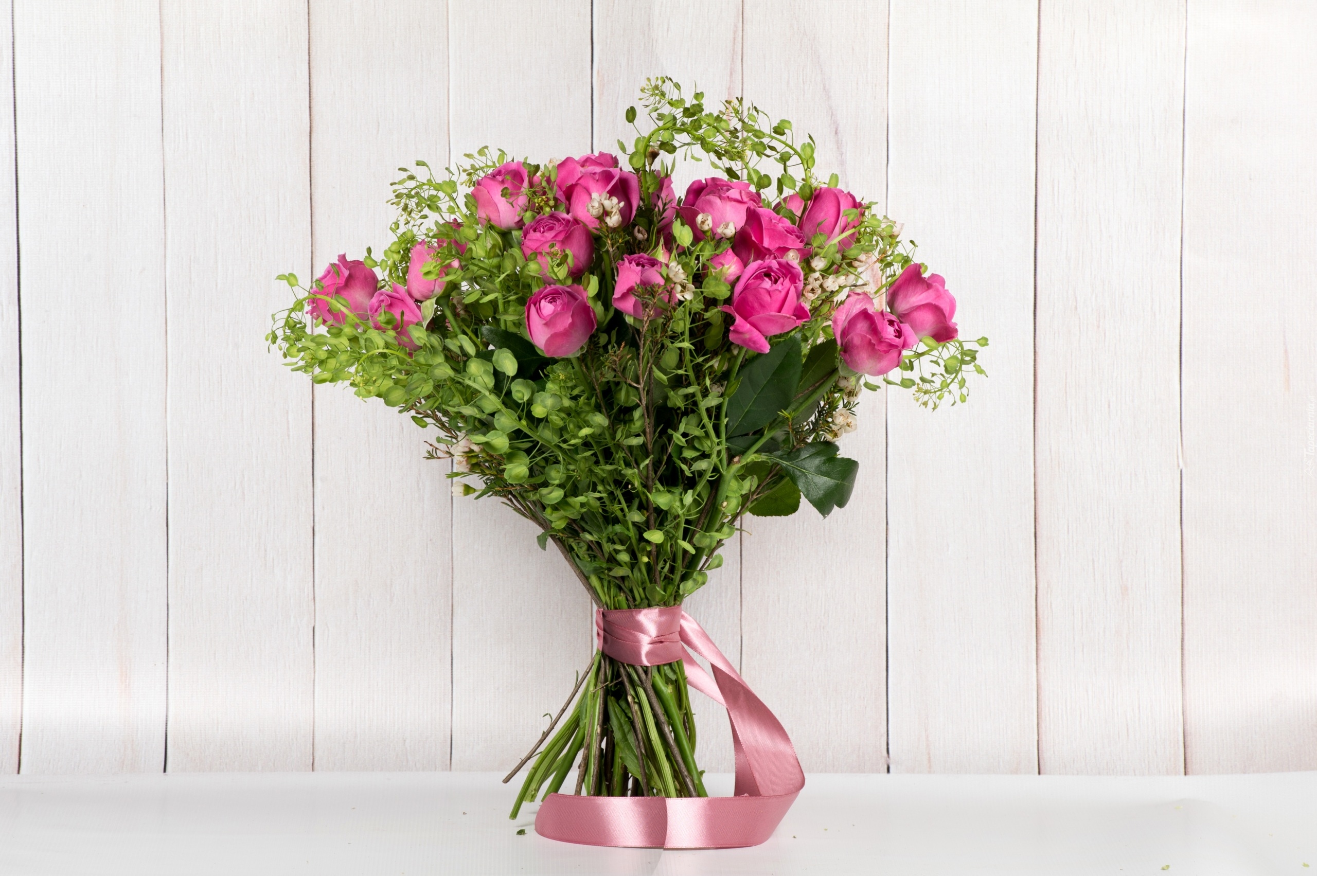 Edytor tapety: Różowe róże w bukiecie przewiązanym wstążką