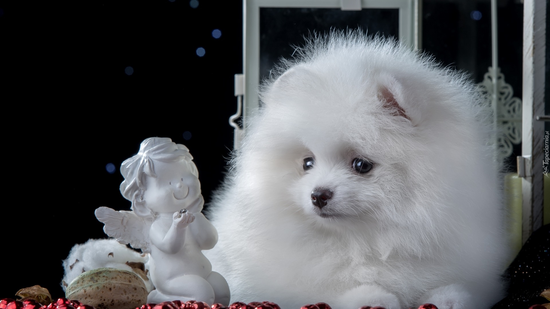 Edytor tapety: Puszysty szczeniak szpica obok figurki aniołka