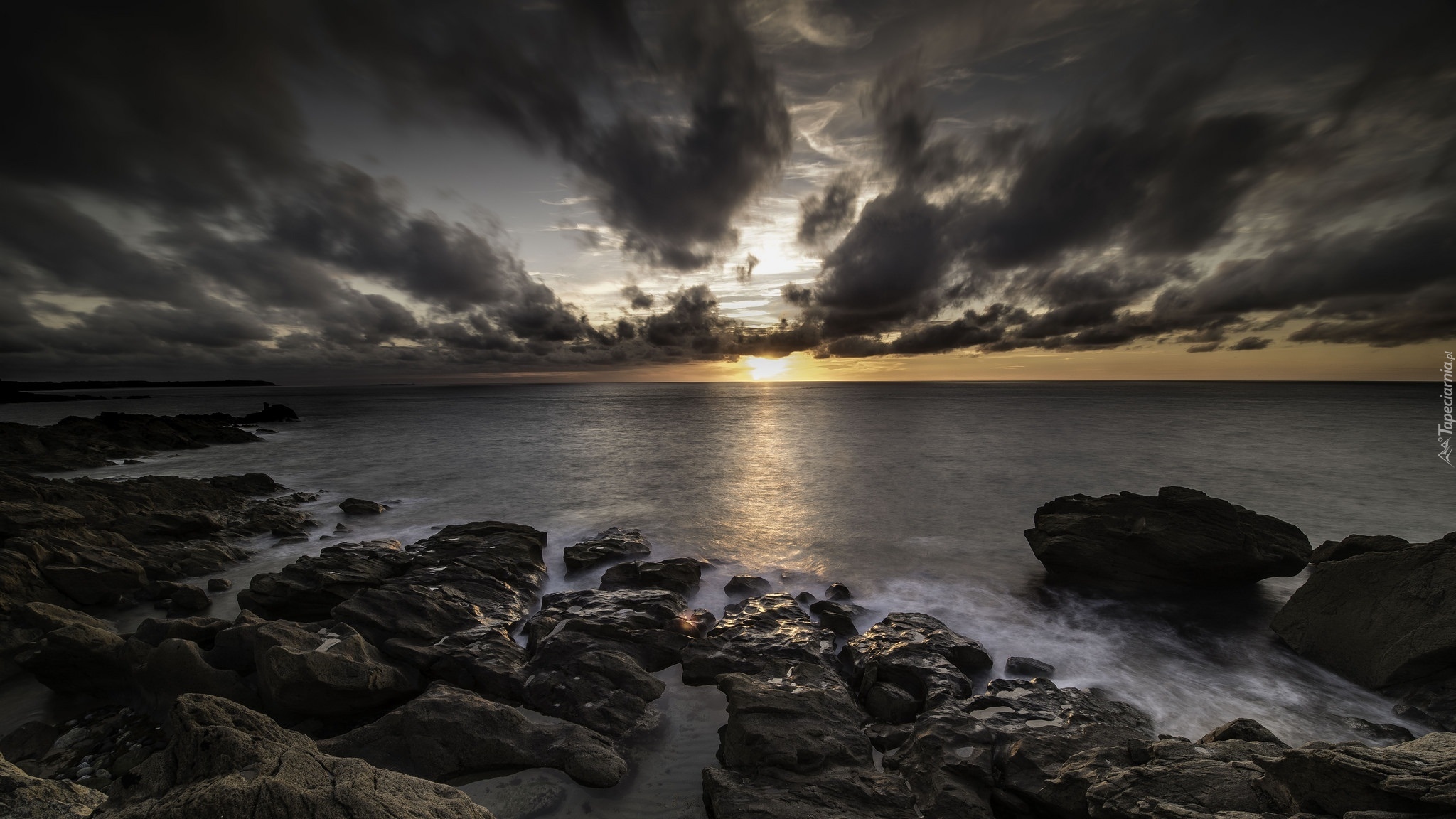 Edytor tapety: Ciemne chmury nad morzem o zachodzie słońca