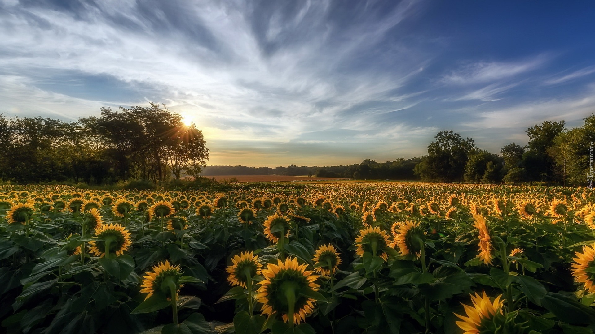 Edytor tapety: Słońce wschodzi nad słonecznikowym polem