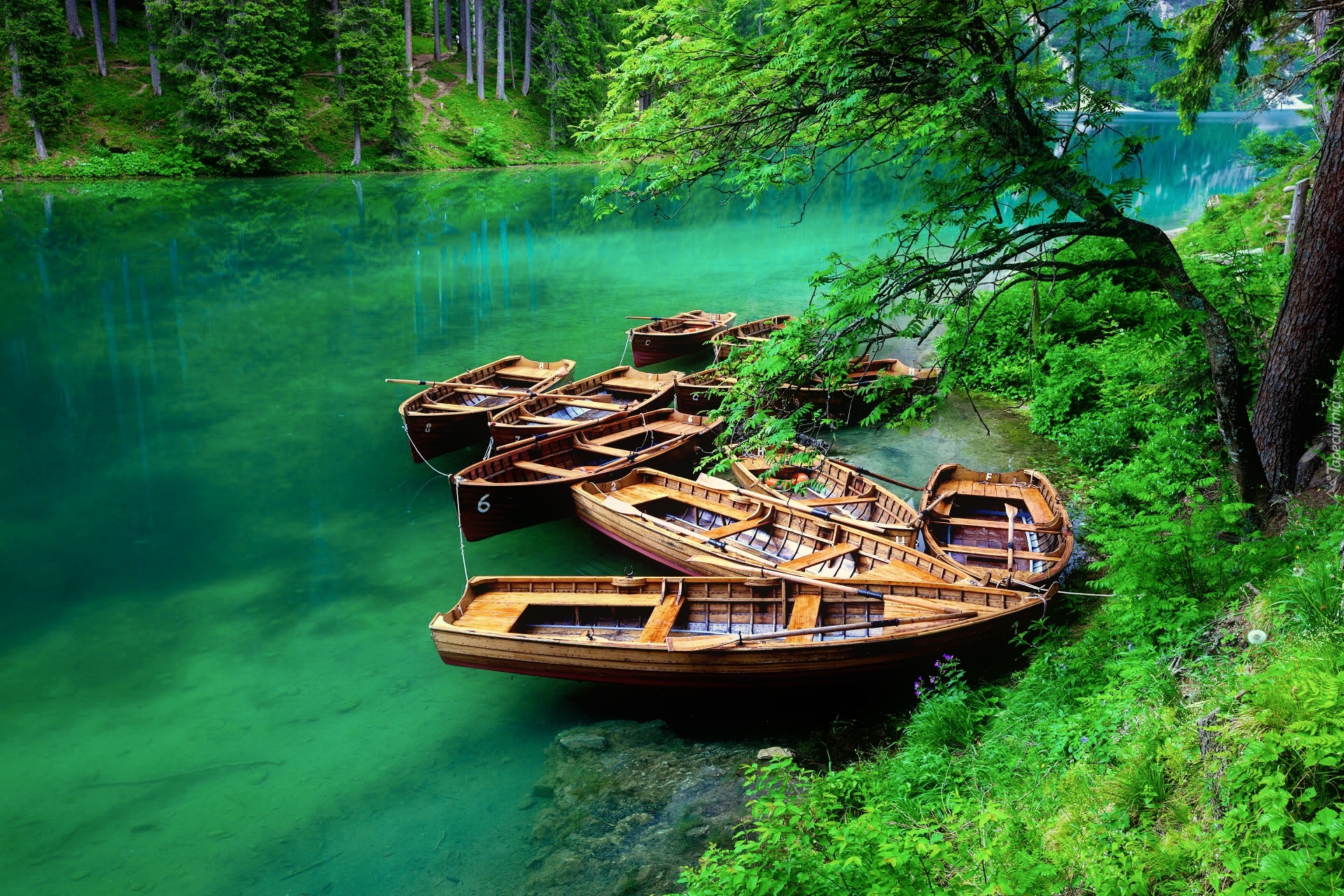 Edytor tapety: Łódki na jeziorze Pragser Wildsee we włoskim Tyrolu