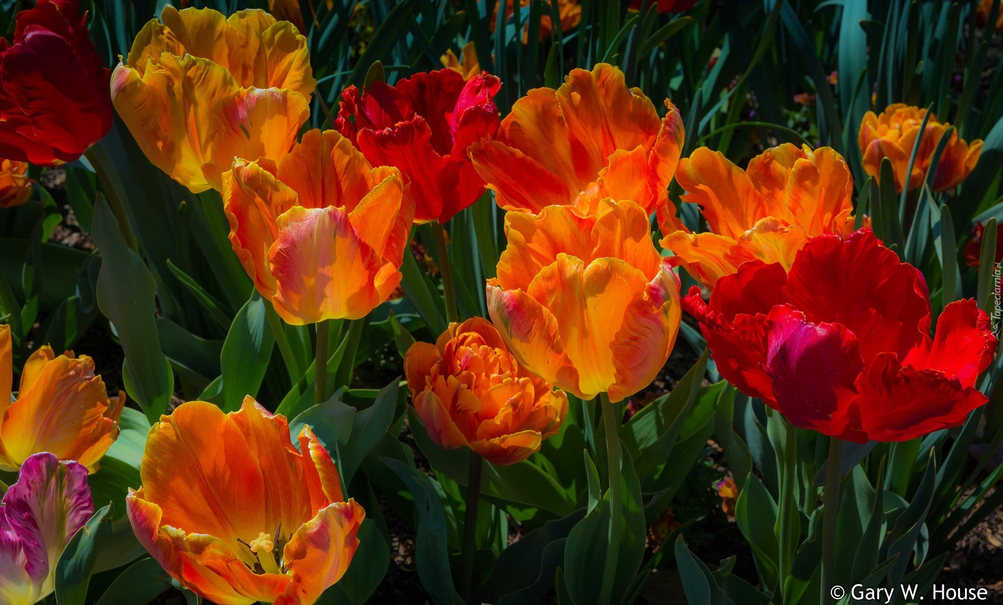 Edytor tapety: Kolorowe tulipany na łodyżkach z liśćmi