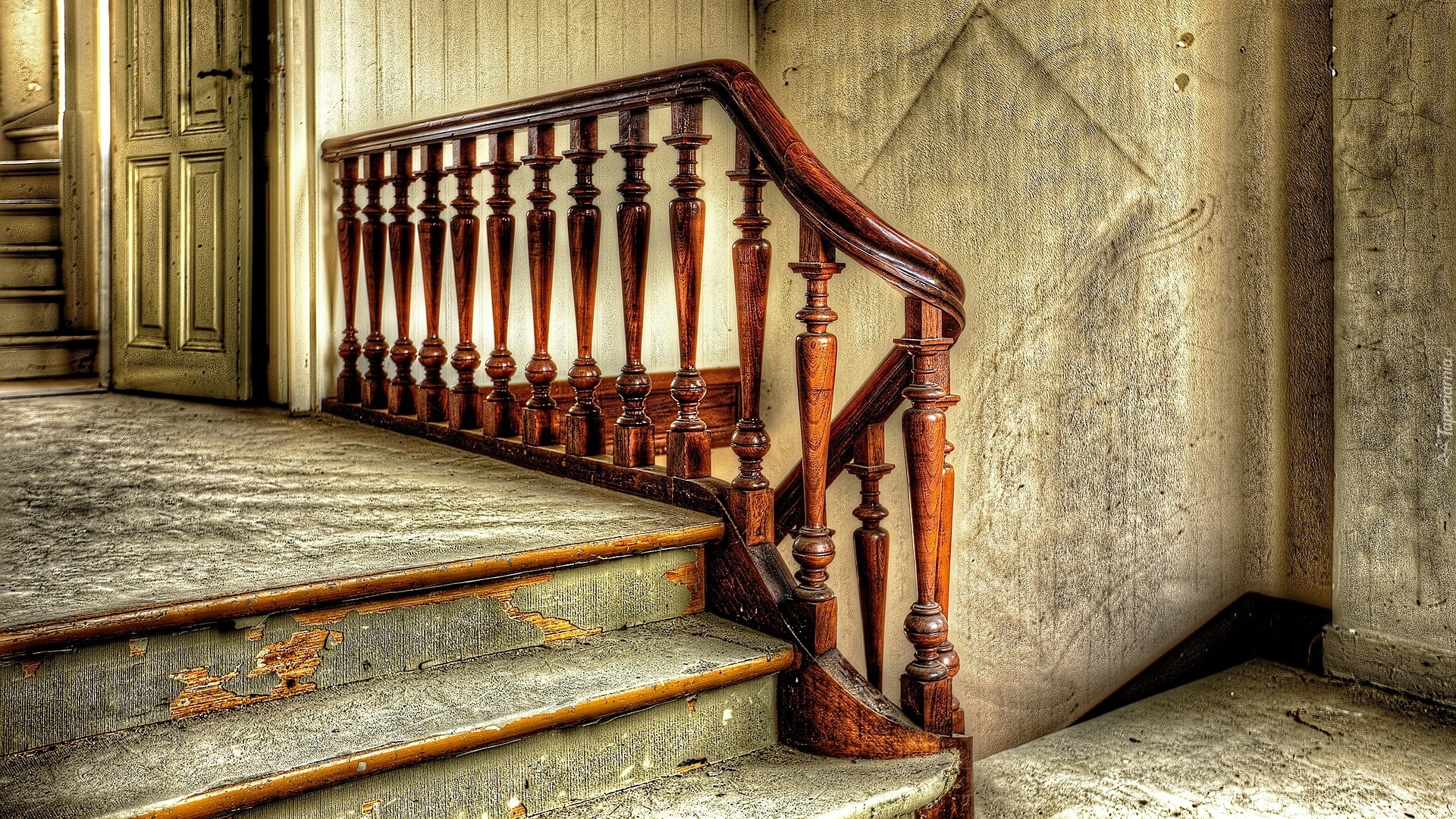 Edytor tapety: Zaniedbany korytarz ze schodami i poręczą