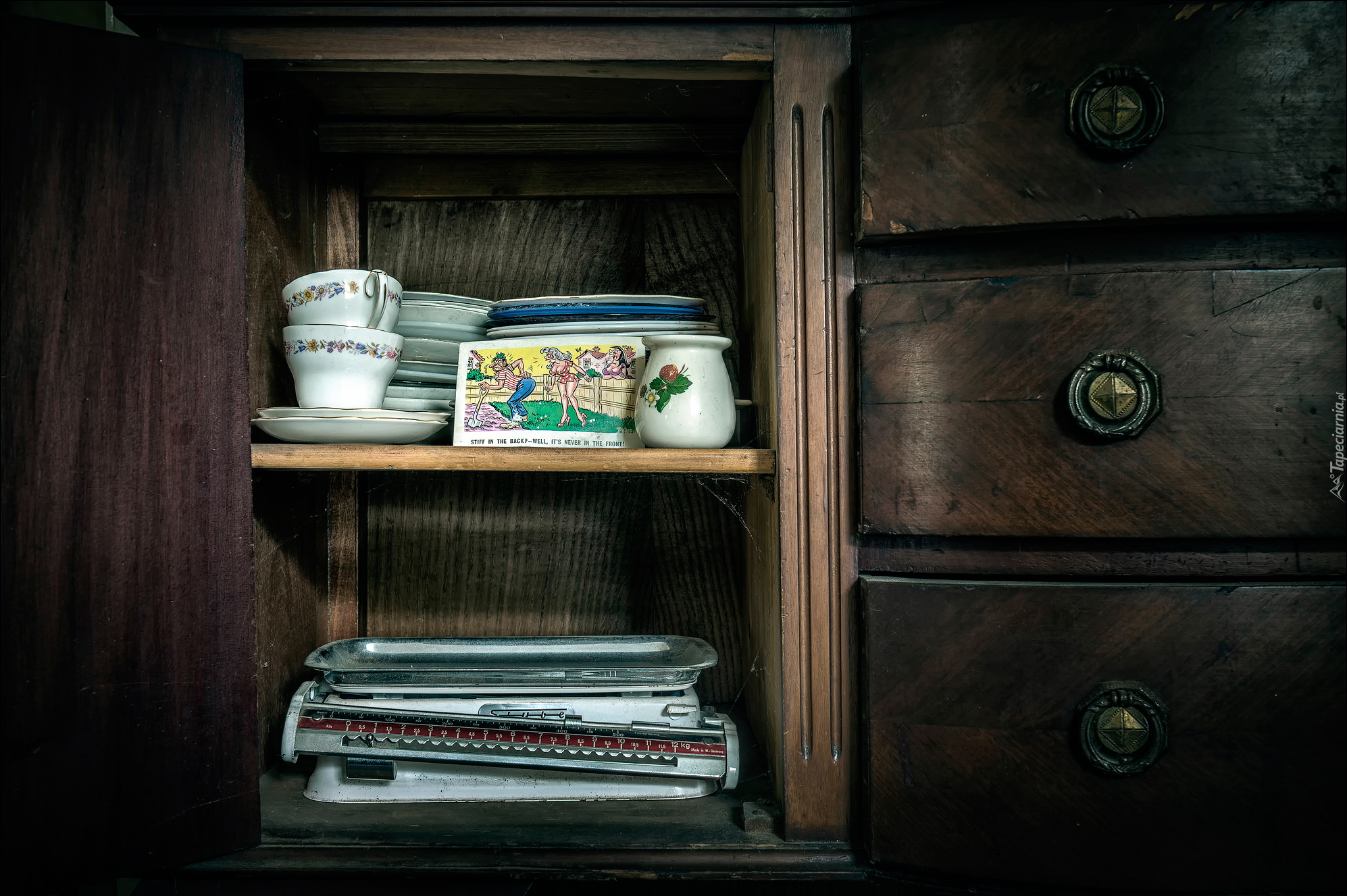 Edytor tapety: Waga i filiżanki z talerzykami ustawione na półkach
