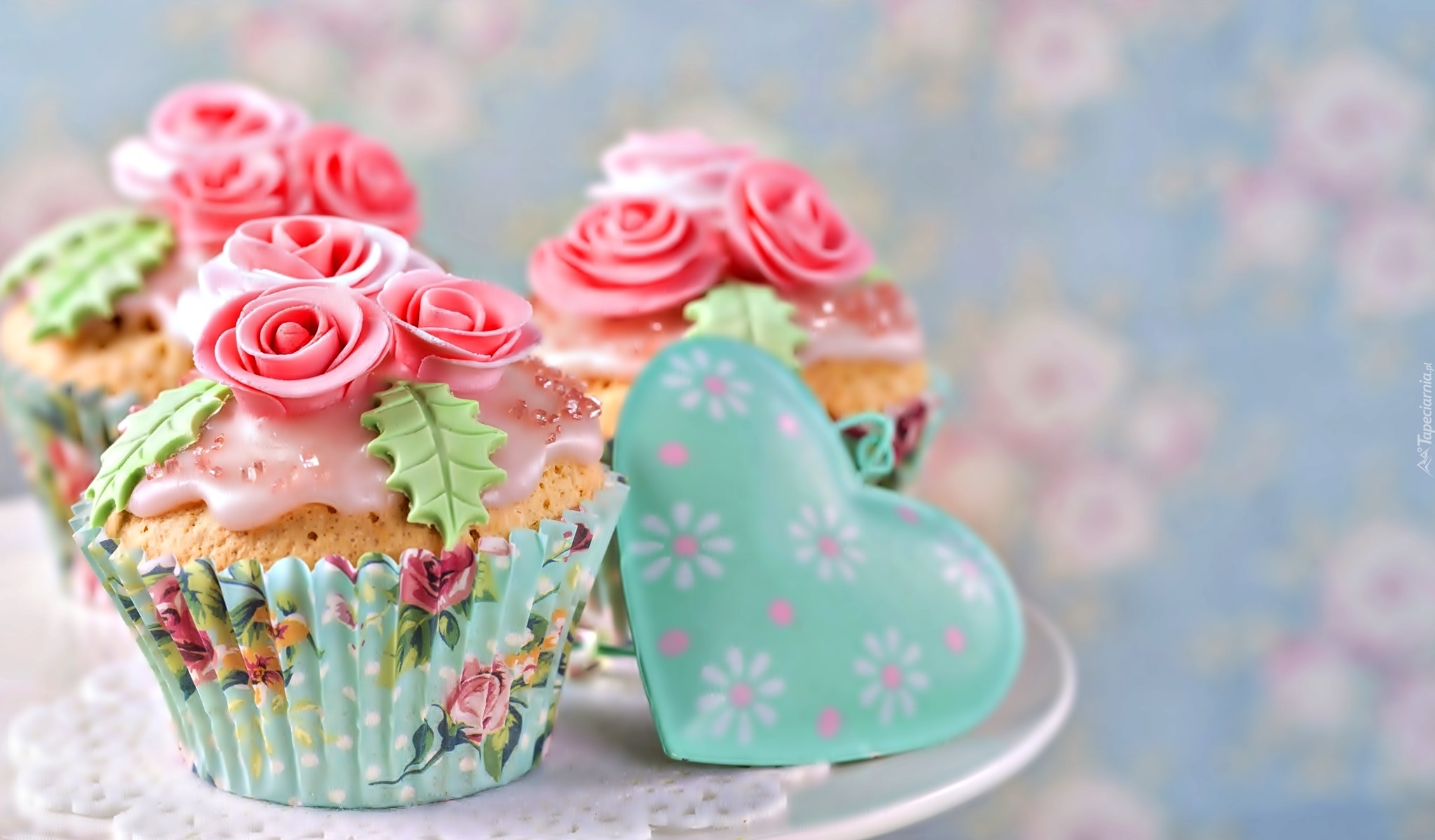 Edytor tapety: Trzy babeczki udekorowane różyczkami obok serduszka