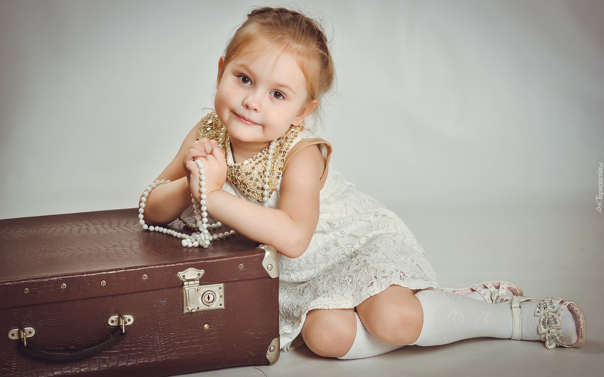 Edytor tapety: Dziewczynka z koralami wsparta na walizce