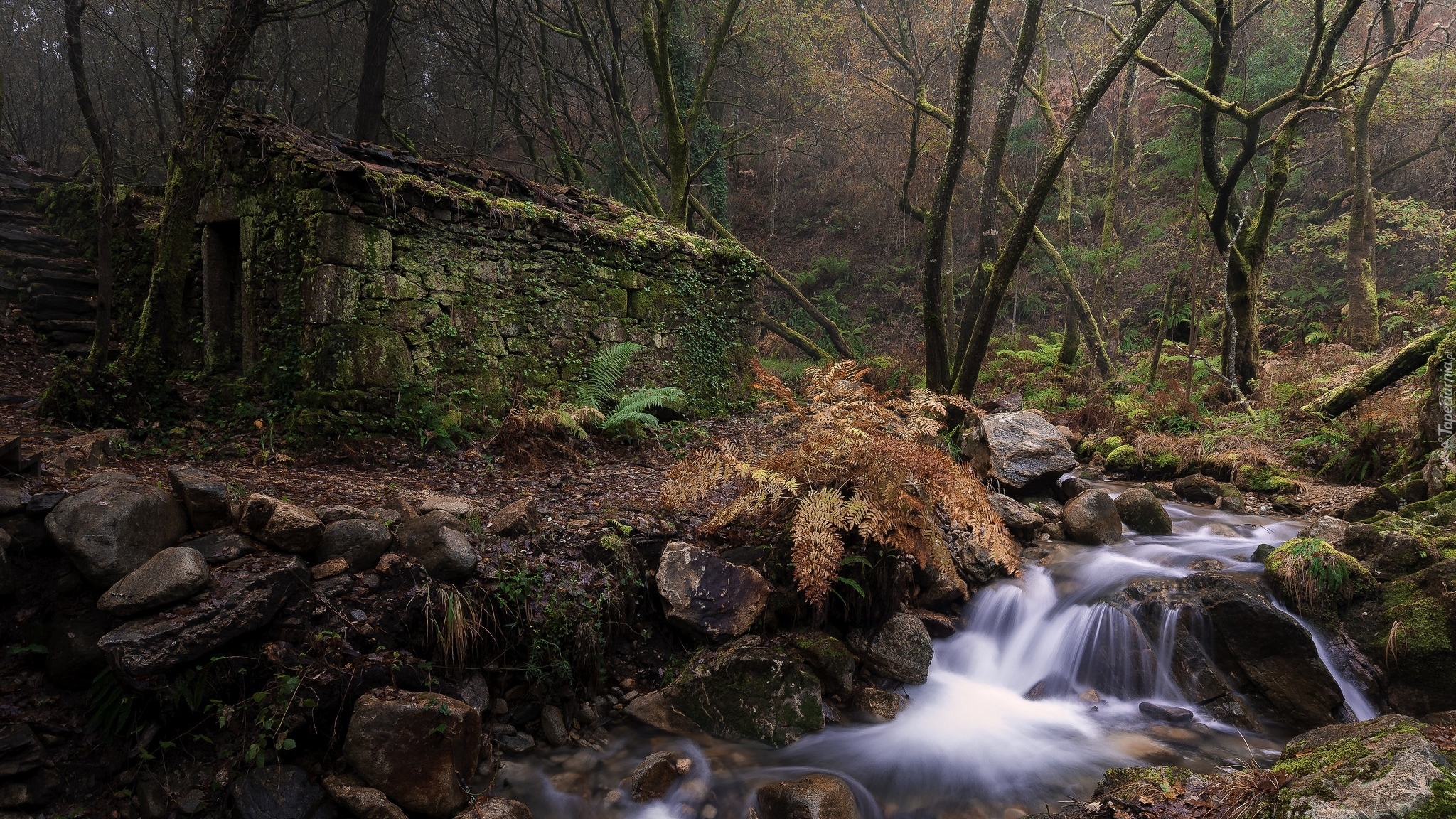 Edytor tapety: Omszała kamienna szopa w lesie nad rzeczką