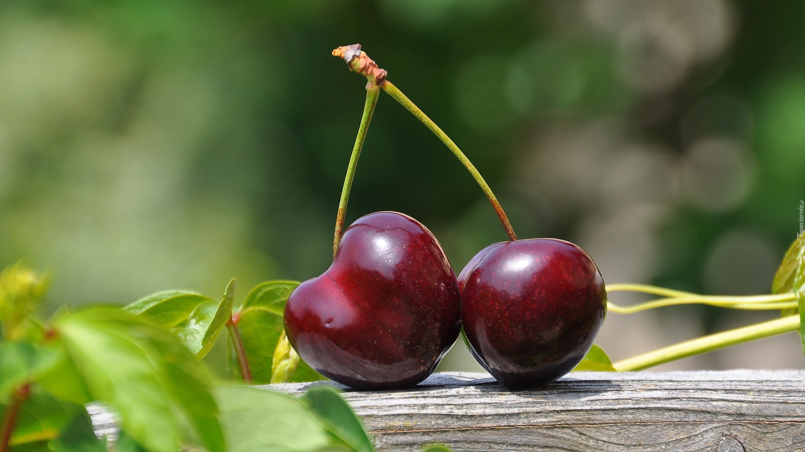 Edytor tapety: Dwie czereśnie położone na deskach obok liści