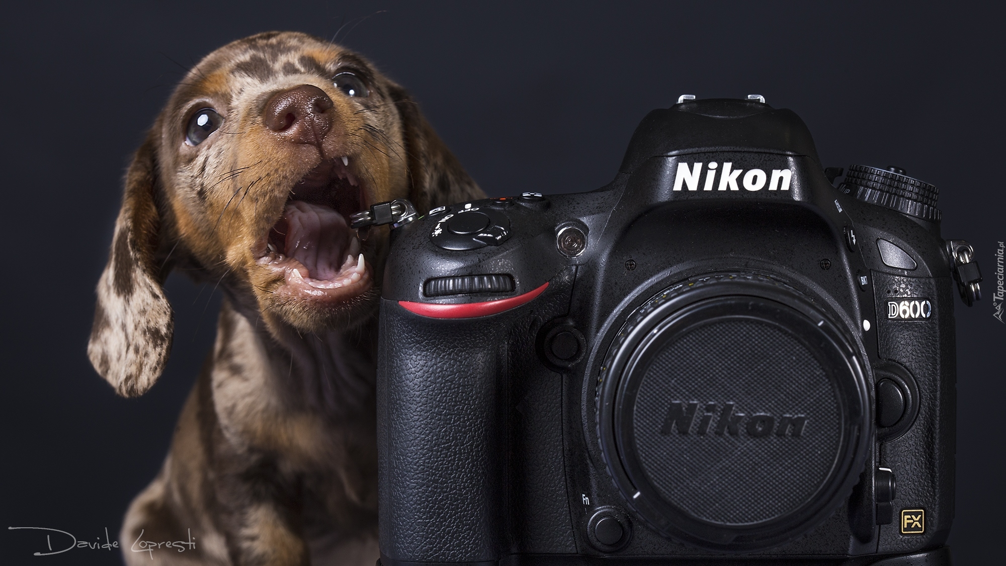 Edytor tapety: Jamnik krótkowłosy gryzący aparat fotograficzny marki Nikon