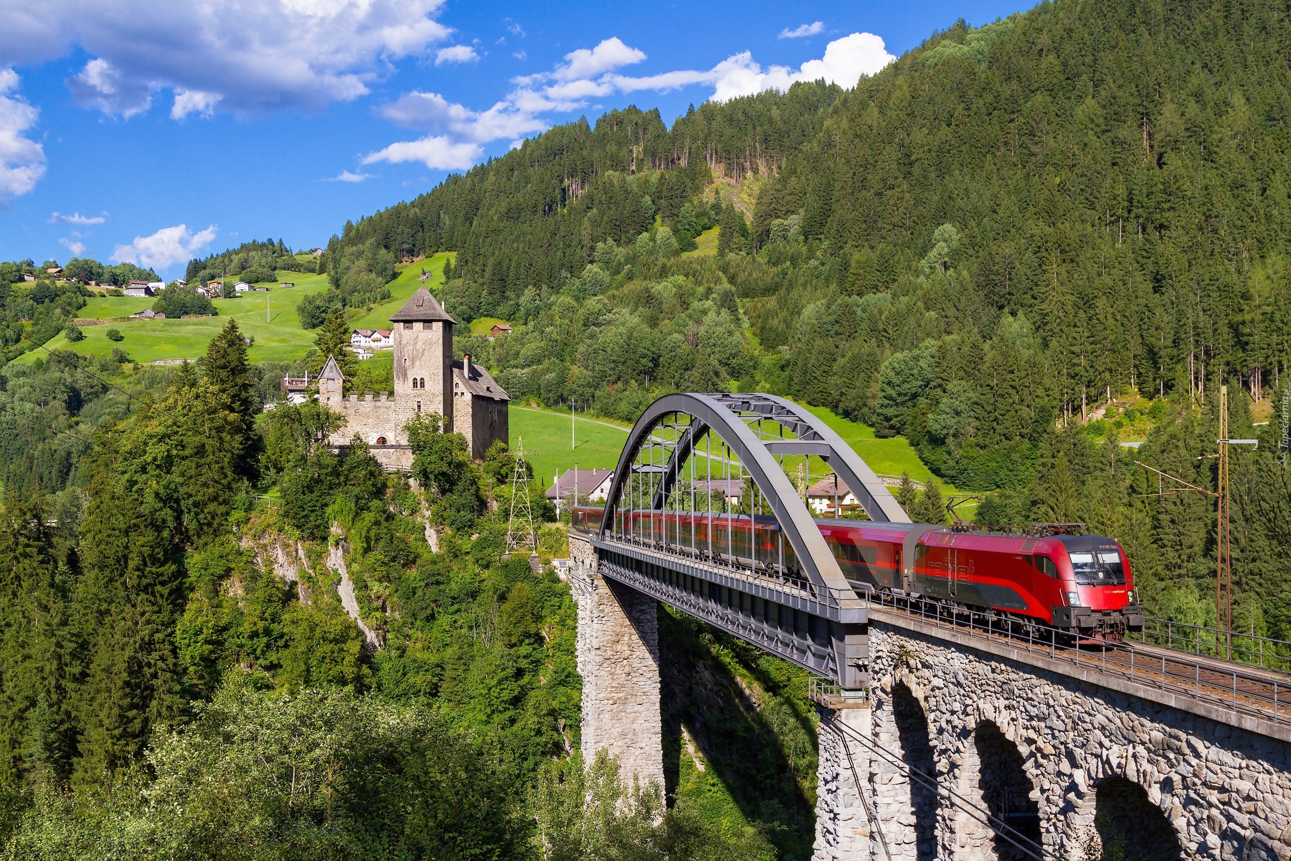 Edytor tapety: Pociąg pedzący przez most Trisanna w Austrii