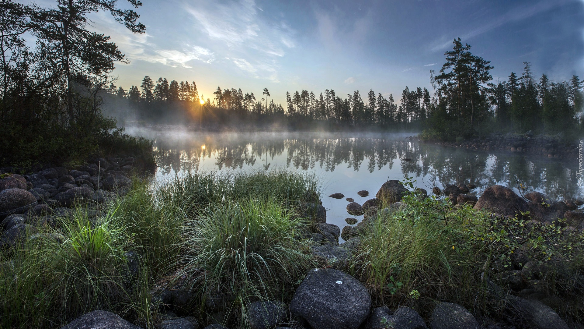 Edytor tapety: Mgła nad otoczonym drzewami jeziorem Ładoga