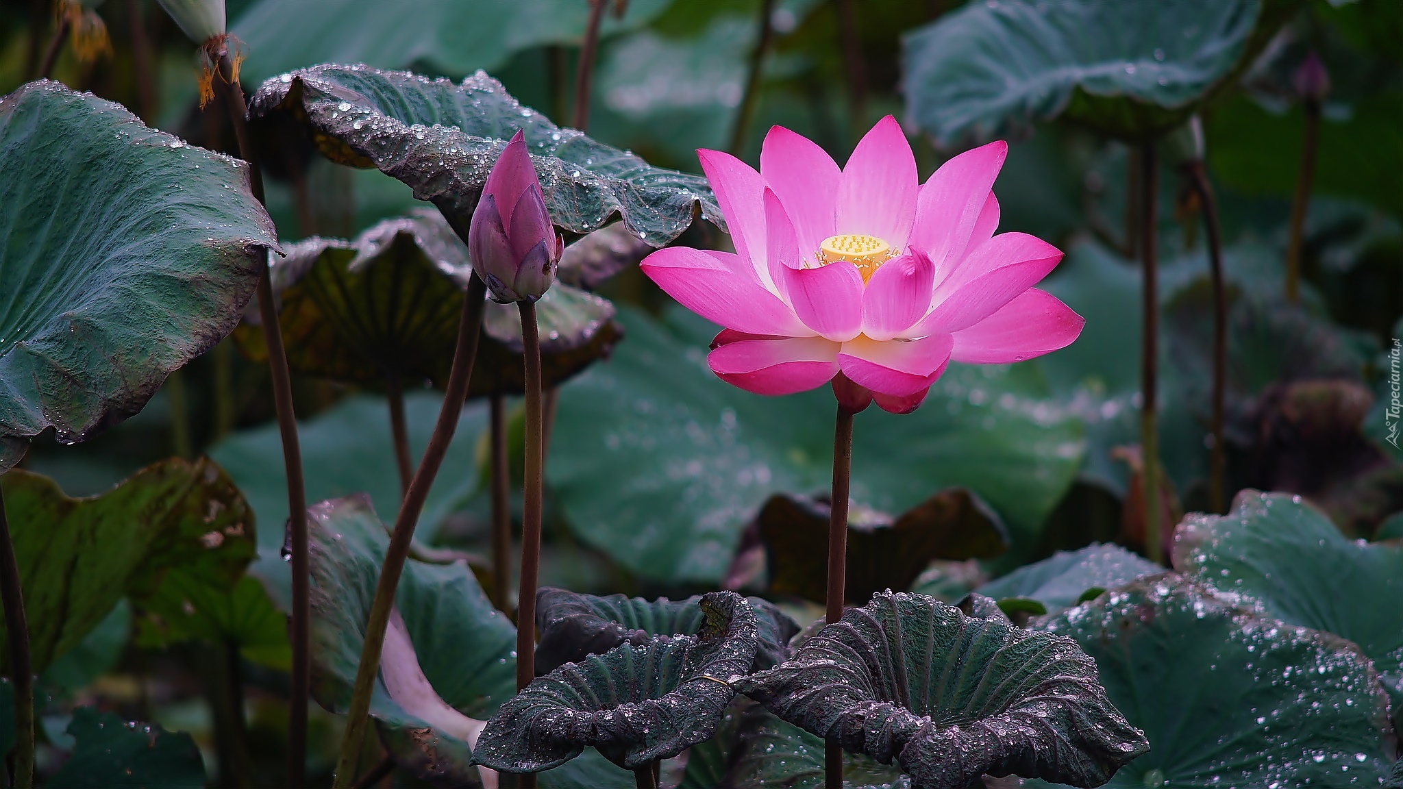 Edytor tapety: Kwiat i pąk lotosu pośród mokrych liści