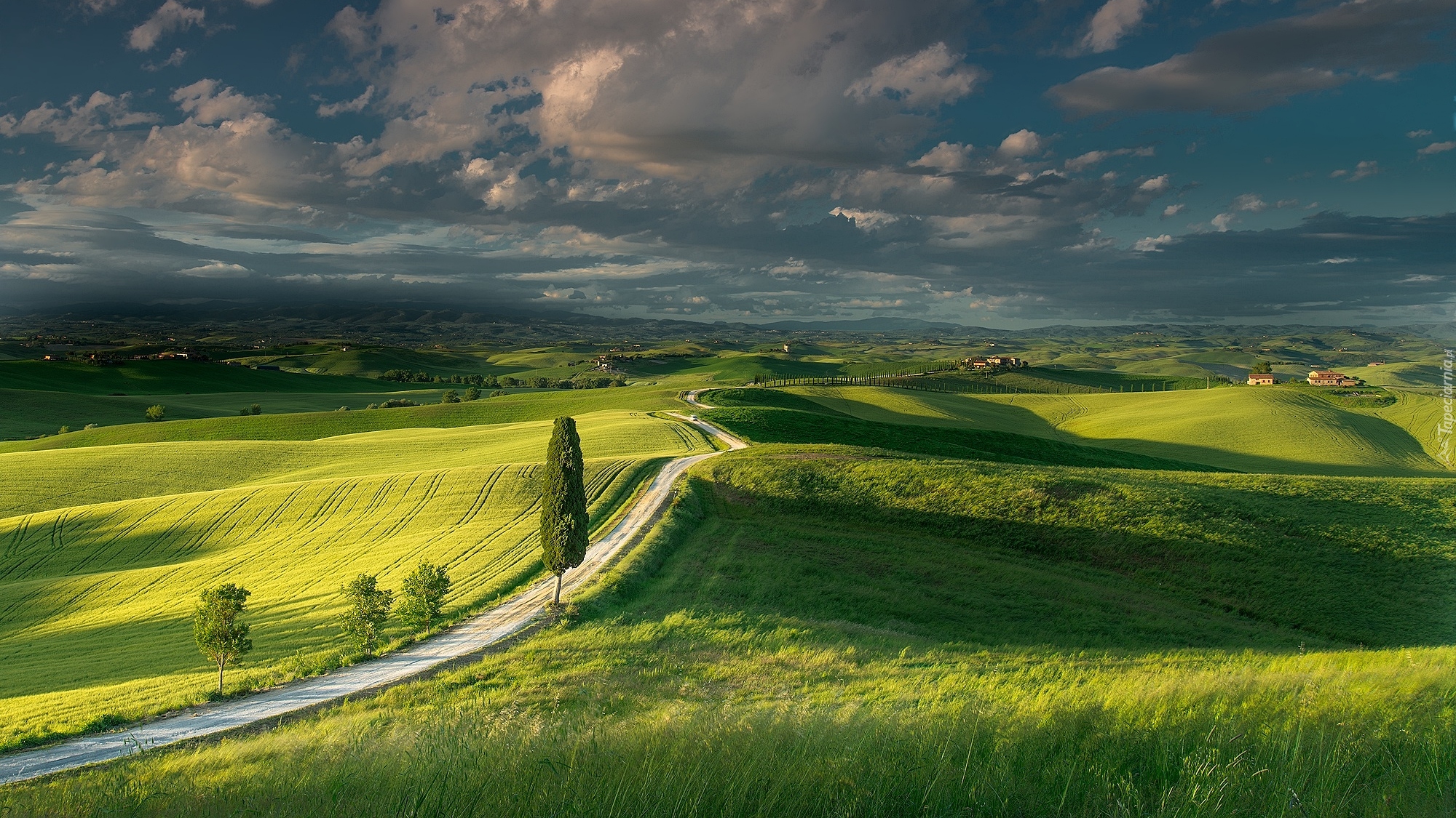 Edytor tapety: Drzewa przy drodze wiodącej przez pola w Toskanii