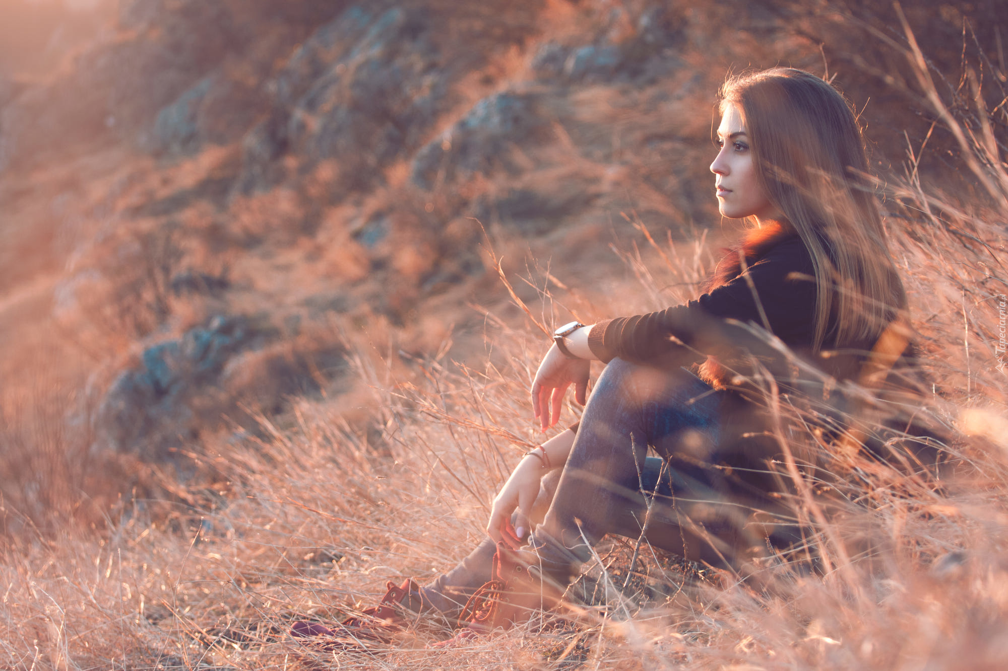 Edytor tapety: Zadumana dziewczyna siedzi na trawie