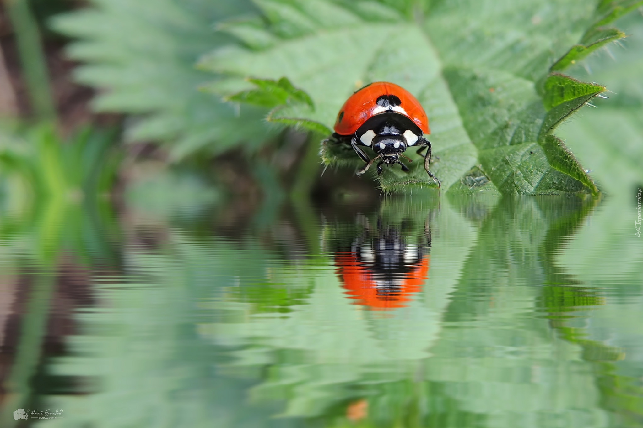 Edytor tapety: Biedronka na liściu odbijająca się w wodzie