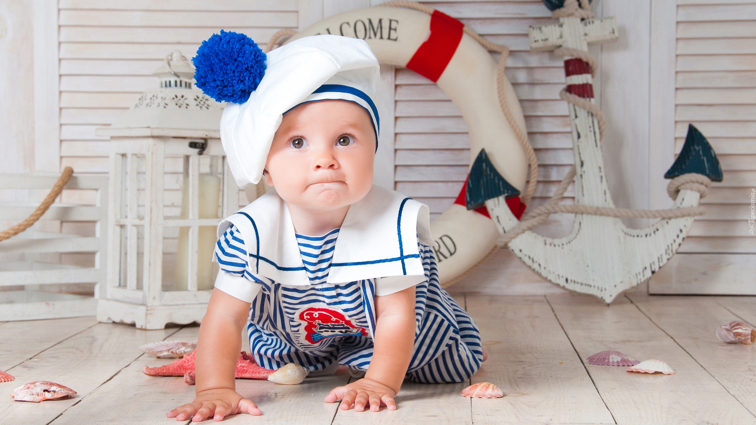 Edytor tapety: Dziecko w stroju marynarza z kotwicą w tle