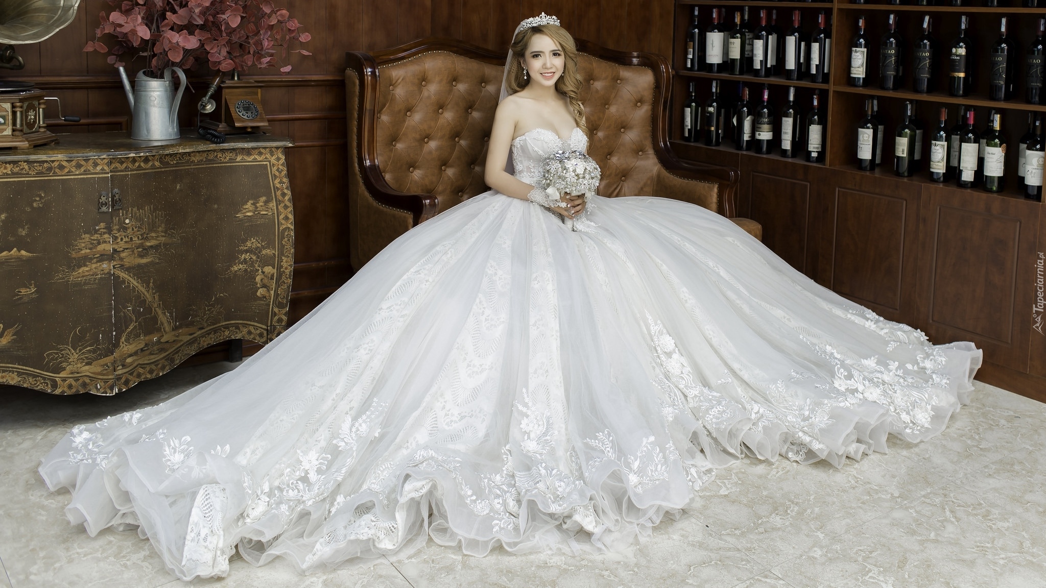 Edytor tapety: Panna młoda w okazałej sukni pozuje na kanapie