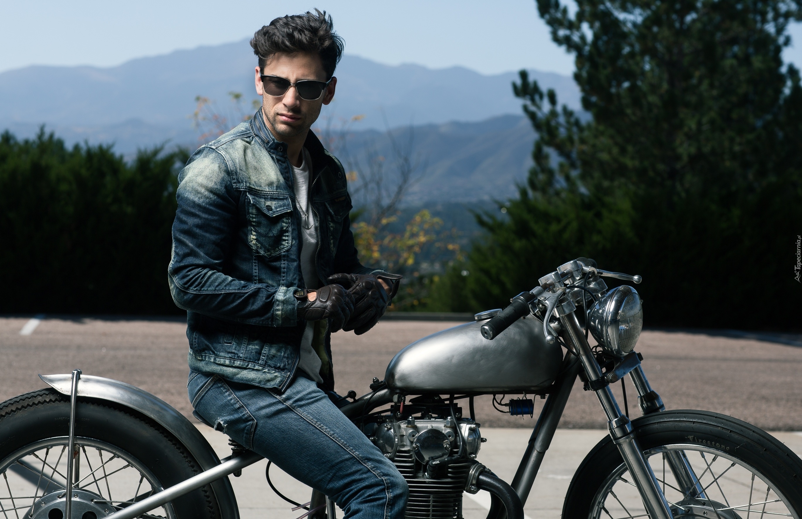 Edytor tapety: Mężczyzna w okularach i dżinsowej kurtce na motocyklu