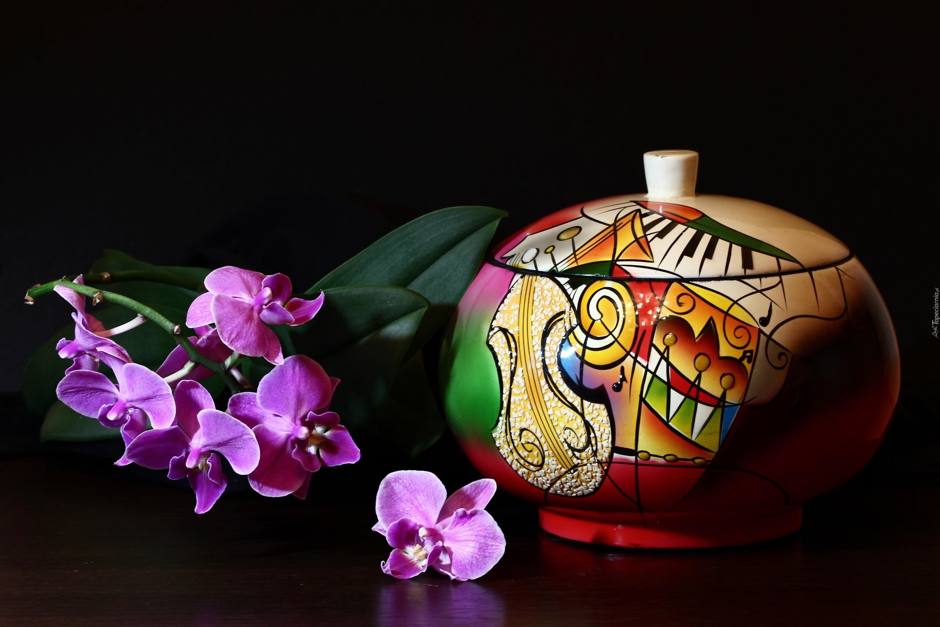 Edytor tapety: Kolorowe naczynie z pokrywką obok gałązki storczyków