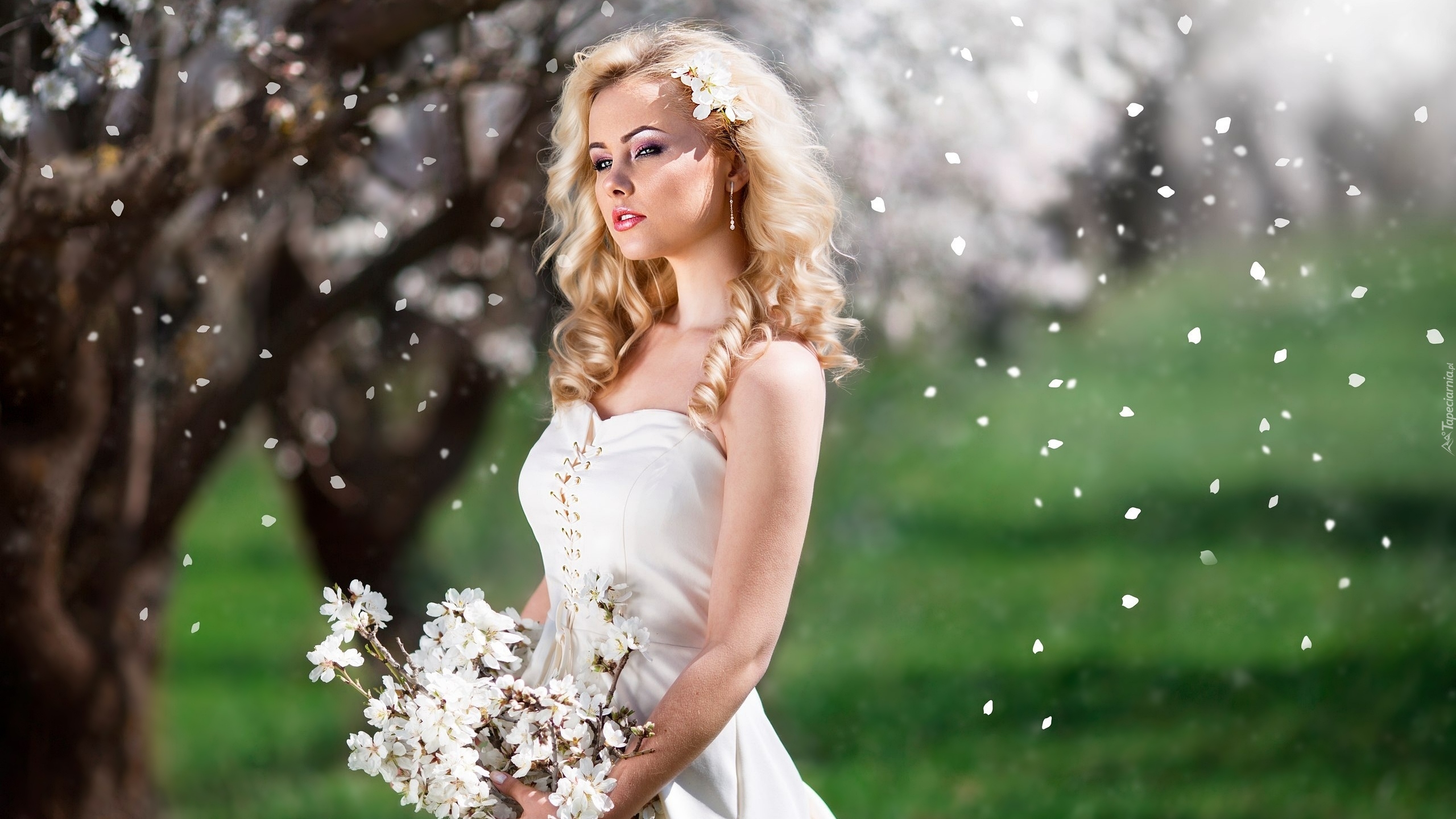 Edytor tapety: Dziewczyna z bukietem wiosennych kwiatów