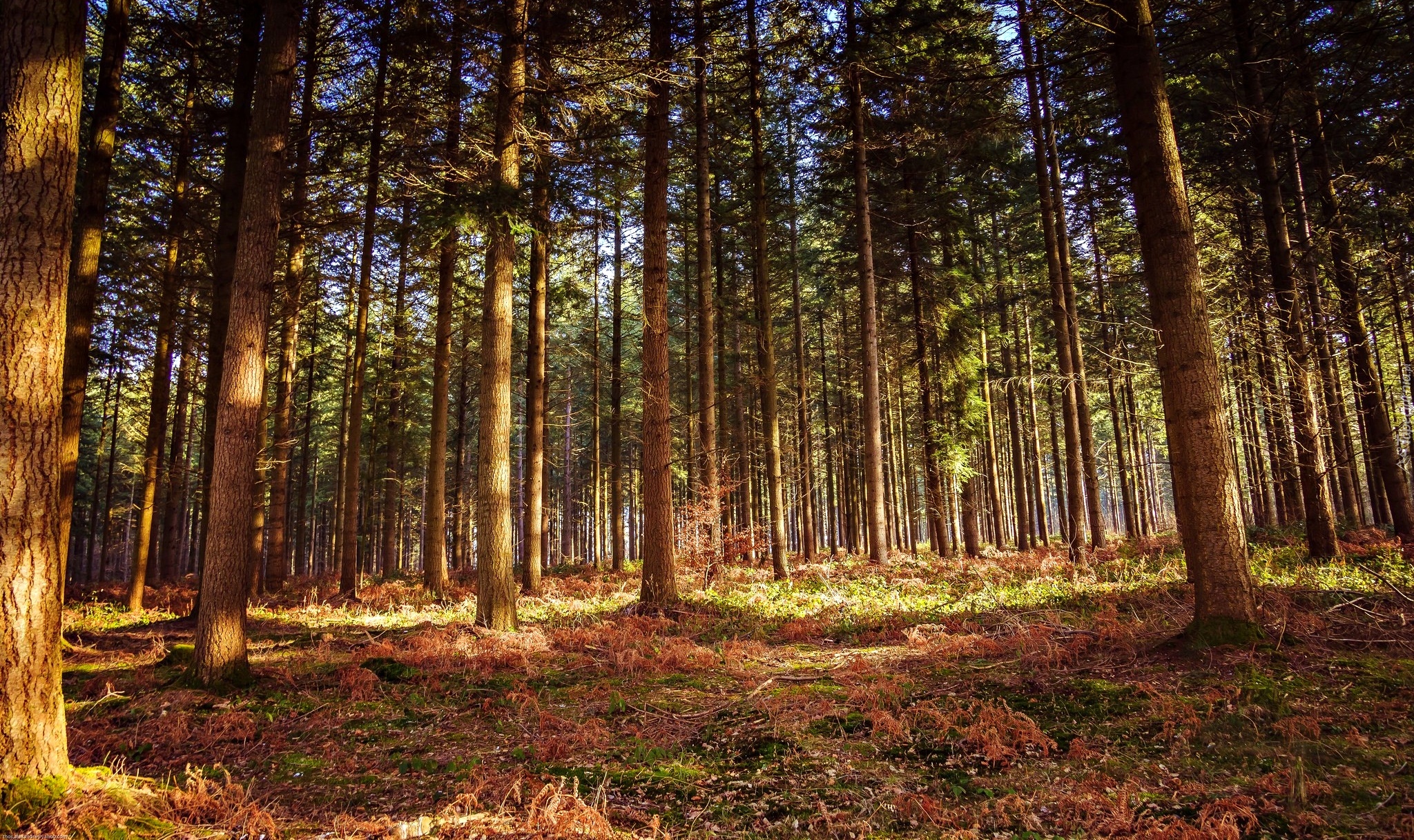 Edytor tapety: Słońce przebijające się między leśnymi drzewami